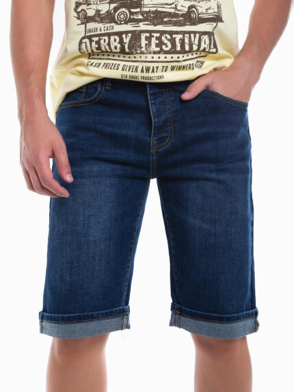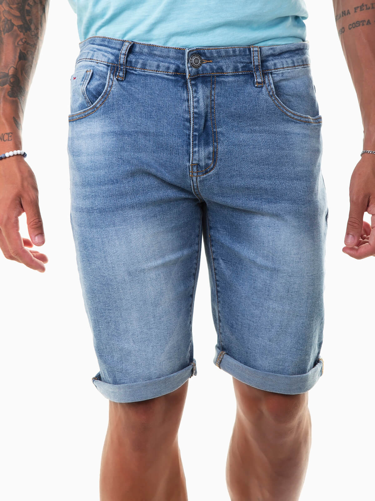 Calções ganga com pormenor de dobra na base. Calções denim elásticos para homem com lavagem azul claro. 5 bolsos. Aperto fecho éclair e botão.