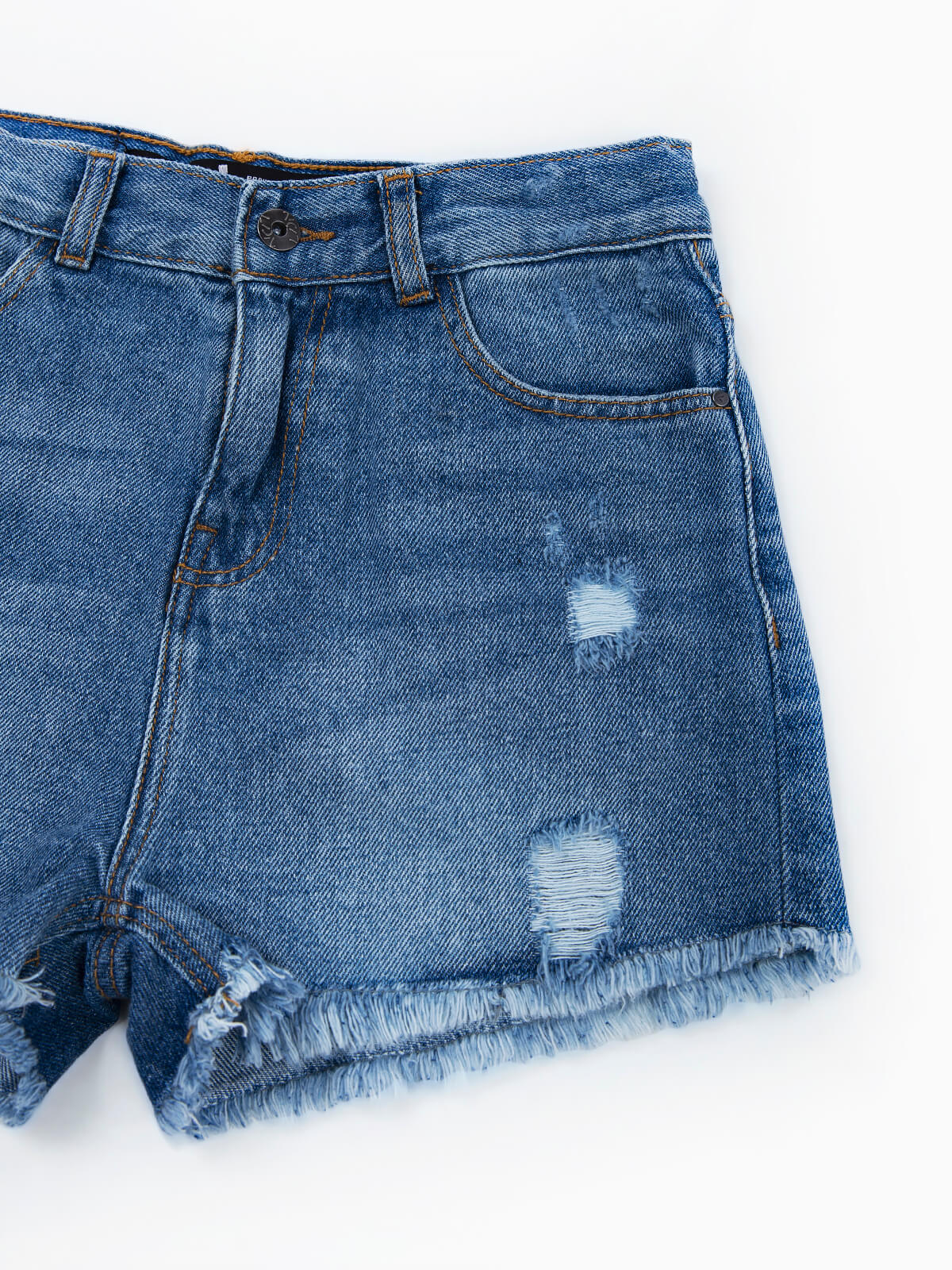 Calções de ganga curtos com base desfiada para menina. Calções com leves rotos e ajustador no interior. Lavagem azul claro. 5 bolsos. Aperto de fecho éclair e botão.