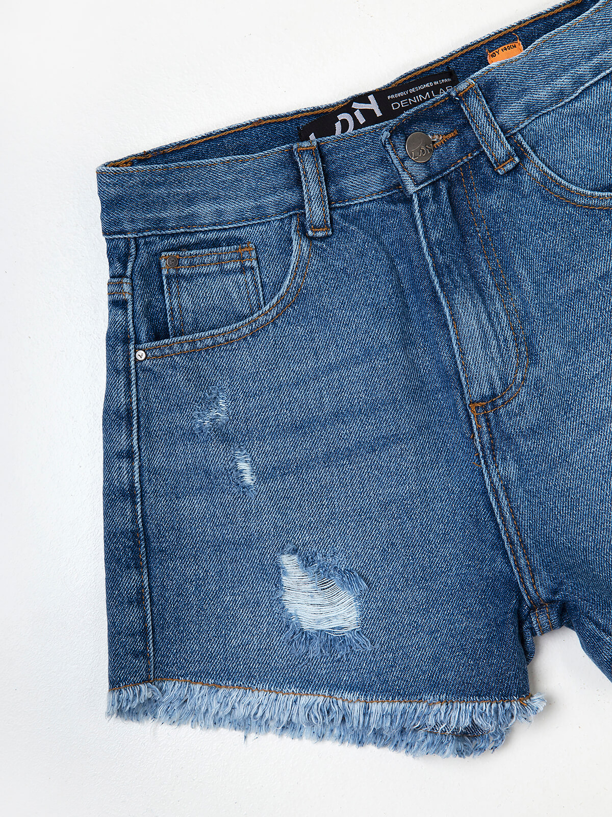 Calções de ganga curtos com base desfiada e pequenos rasgos. Calções com ajustador no interior. Lavagem azul claro. 5 bolsos. Aperto de fecho zíper e botão.