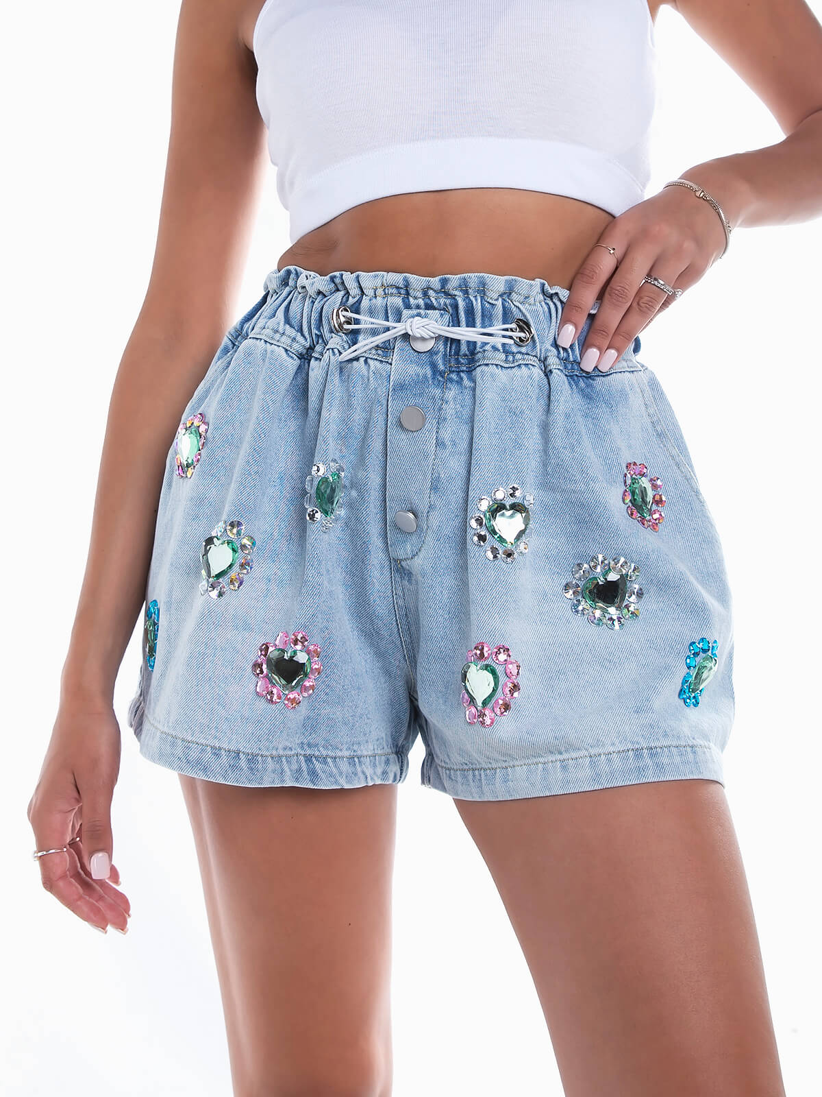Calções de ganga curtos com aplicações de jóias brilhantes. Calções de cintura alta acabada em folho com elástico para ajustar. 2 bolsos laterais. Botões decorativos.