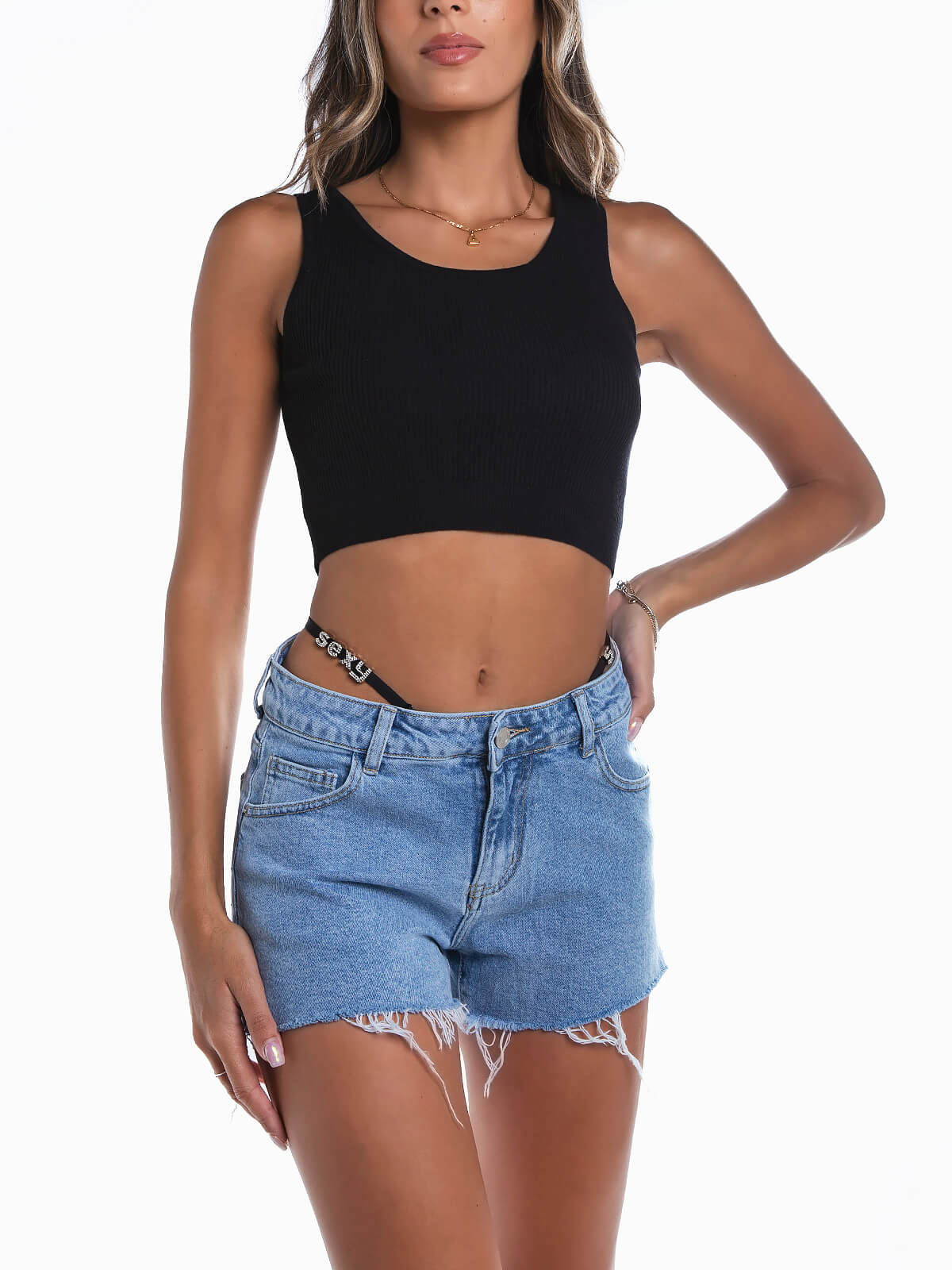 Calções curtos mom fit de cintura baixa para senhora. Calções lavagem azul claro com base desfiada. Elásticos removíveis com brilhantes aplicados. 5 bolsos. Aperto fecho éclair e botão.
