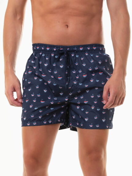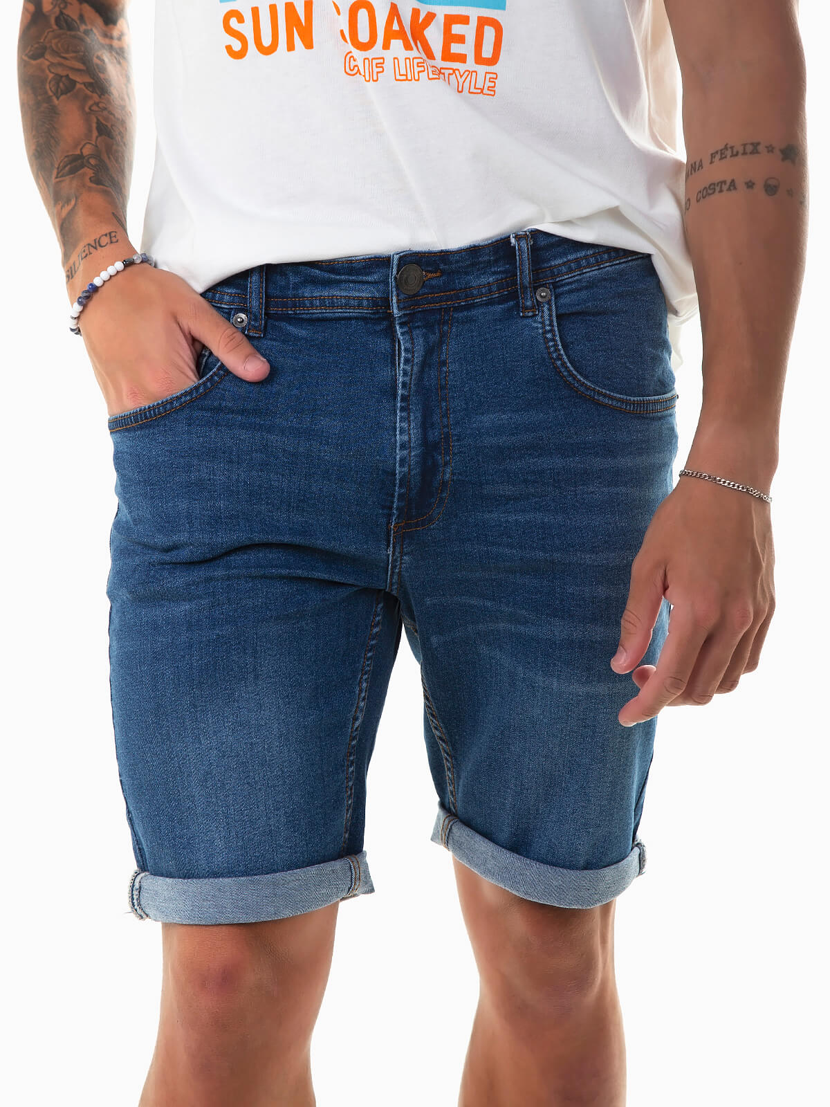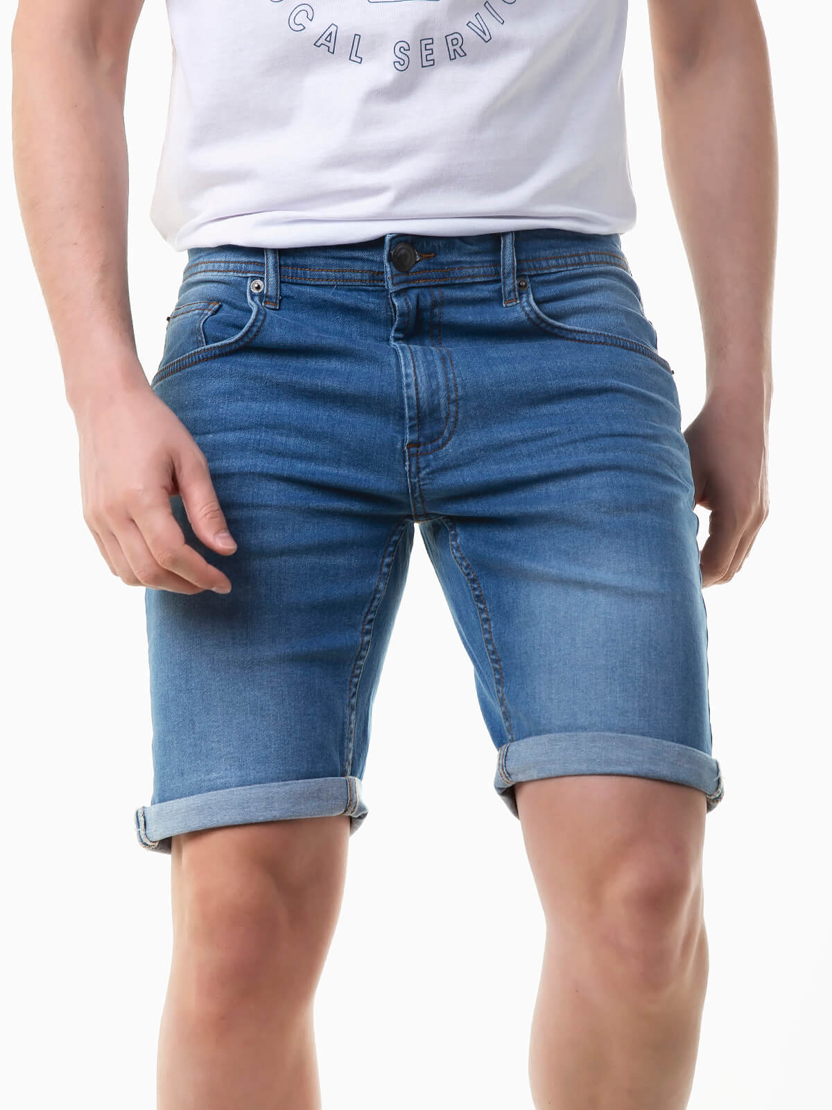 Calções ganga elásticos com lavagem azul claro. Calções para homem com 5 bolsos. Aperto de fecho zíper e botão.