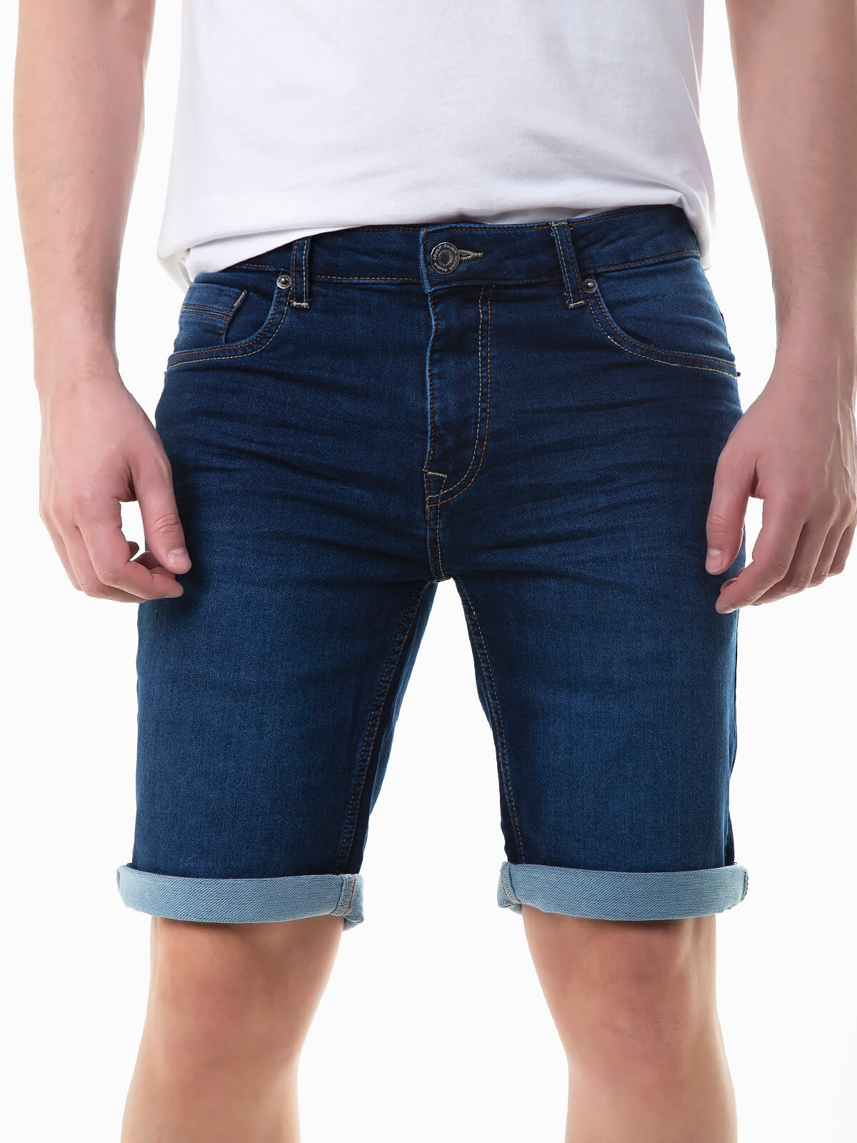 Calções ganga elásticos com lavagem azul escuro para homem. Calções slim fit com 5 bolsos. Aperto fecho éclair e botão.