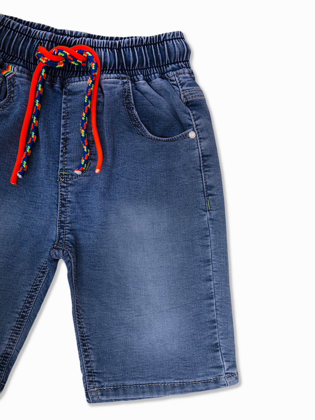 Calções de ganga de lavagem azul claro para menino. Cintura elástica com pormenor de cordão néon. Braguilha falsa. 5 bolsos.