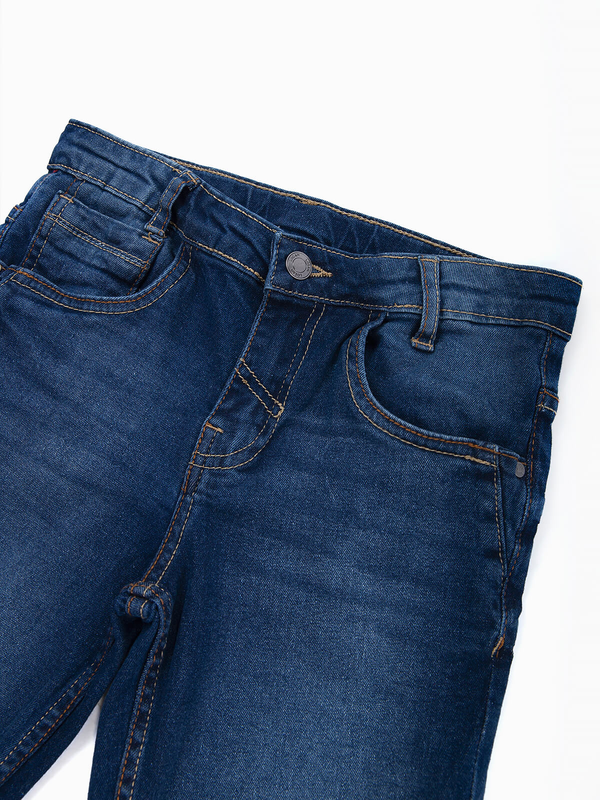 Calções de ganga elásticos para menino. Bermudas com ajustador no interior. 5 bolsos. Aperto de fecho éclair e botão.