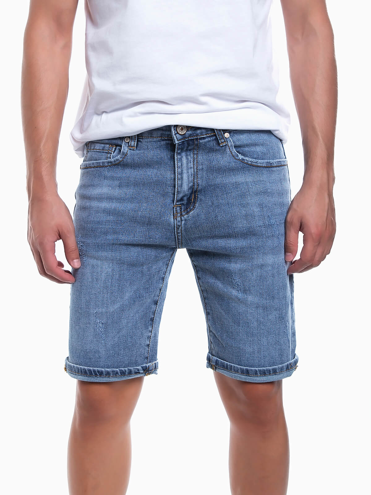 Calções de ganga com lavagem azul clara manchada. Calções para homem com leves rotos. 5 bolsos. Aperto de fecho éclair e botão.
