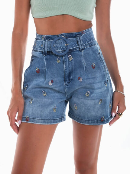 Calções ganga brancos com bordado de borboletas. Calções compridos de cintura alta com 5 bolsos. Aperto de fecho éclair e botão.