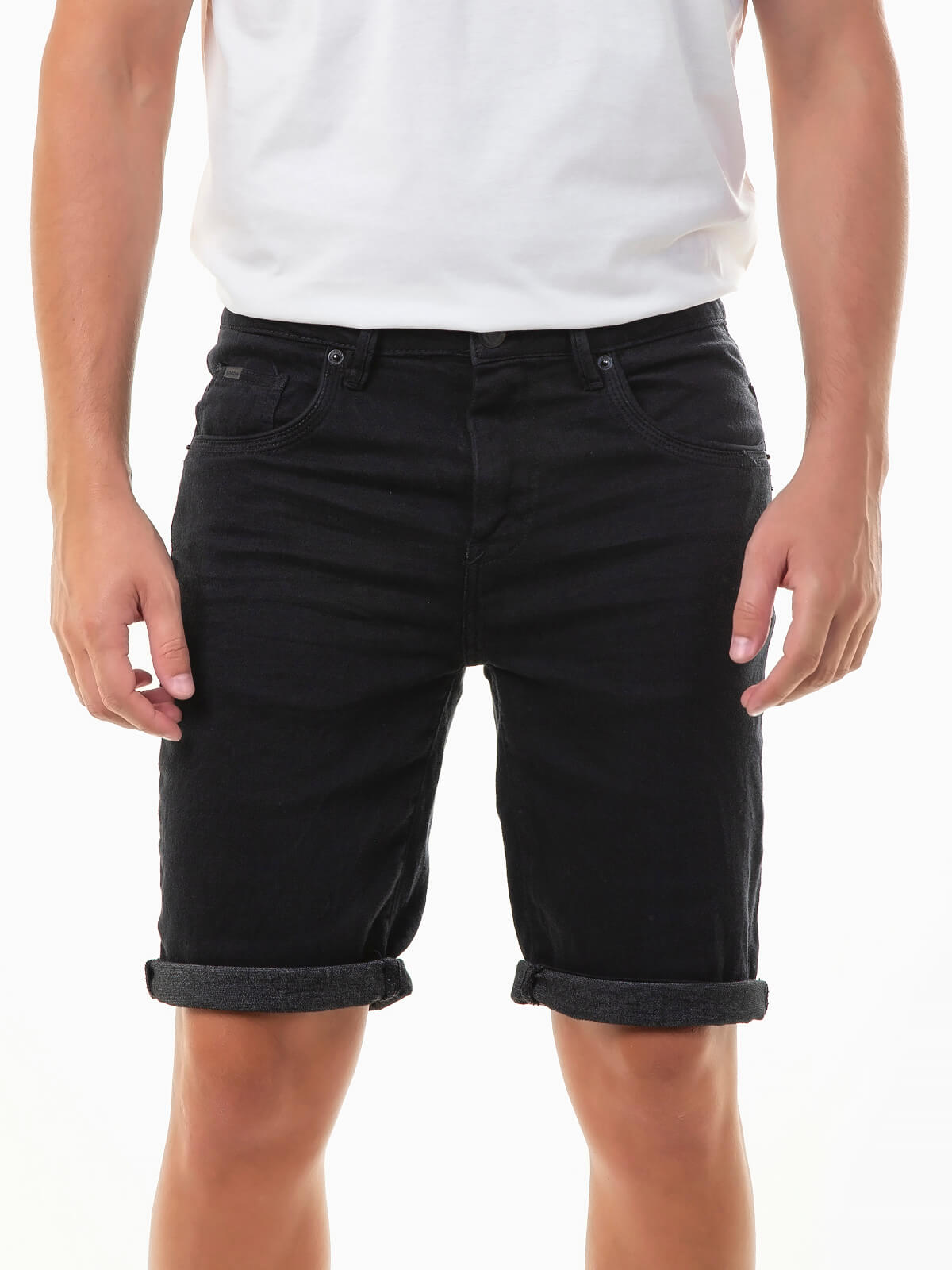 Calções de ganga pretos para homem. Calções elásticos com 5 bolsos. Dobra na base. Aperto fecho éclair e botão.