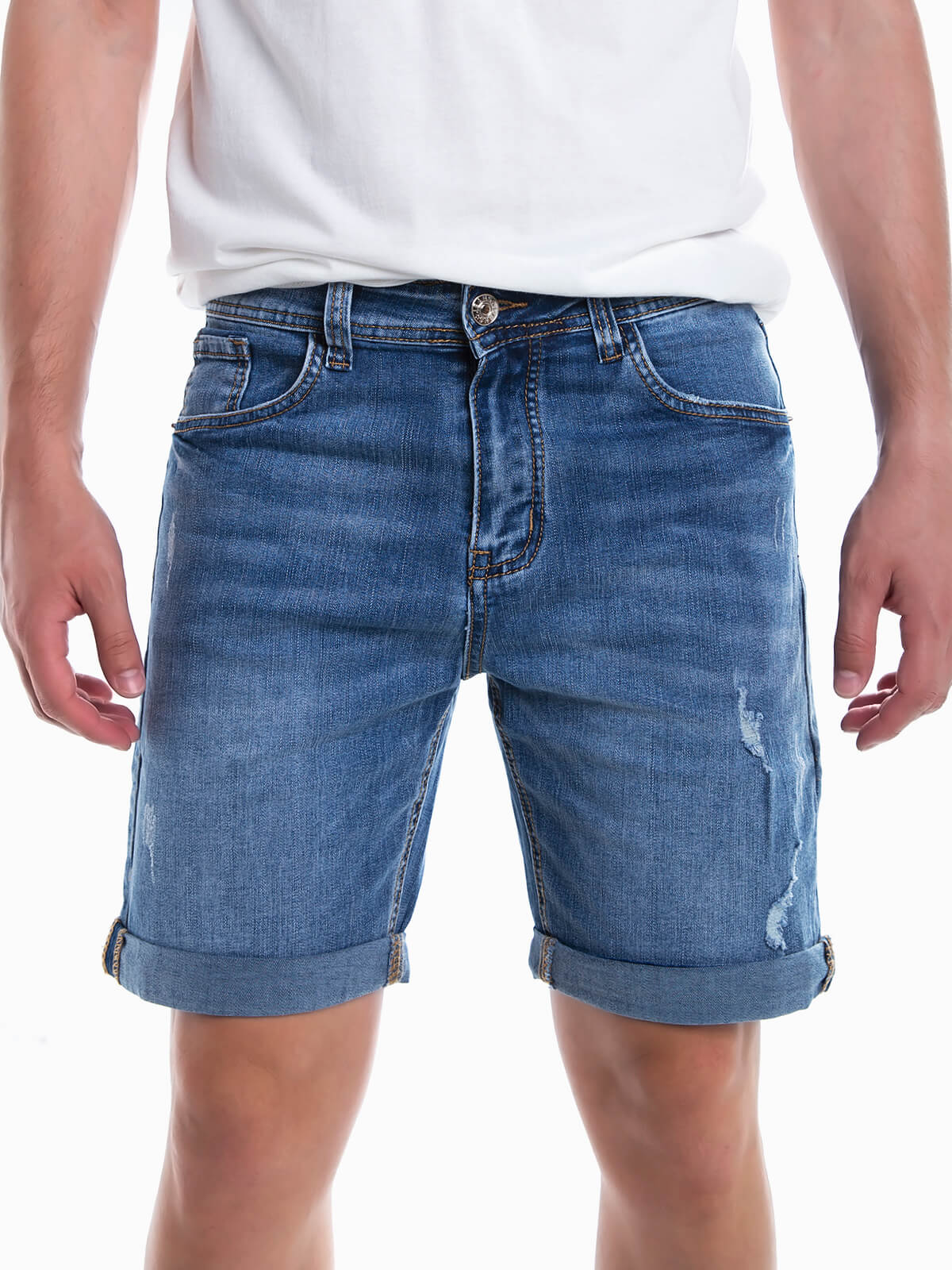 Calções de ganga regular fit para homem. Calções denim com pequenos rotos. 5 bolsos. Aperto de fecho éclair e botão.