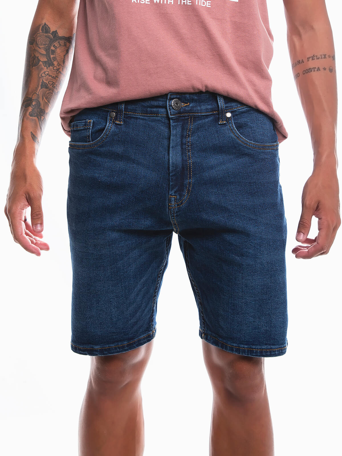 Calções ganga slim fit com lavagem azul escuro para homem. Calções com 5 bolsos. Aperto de fecho éclair e botão.