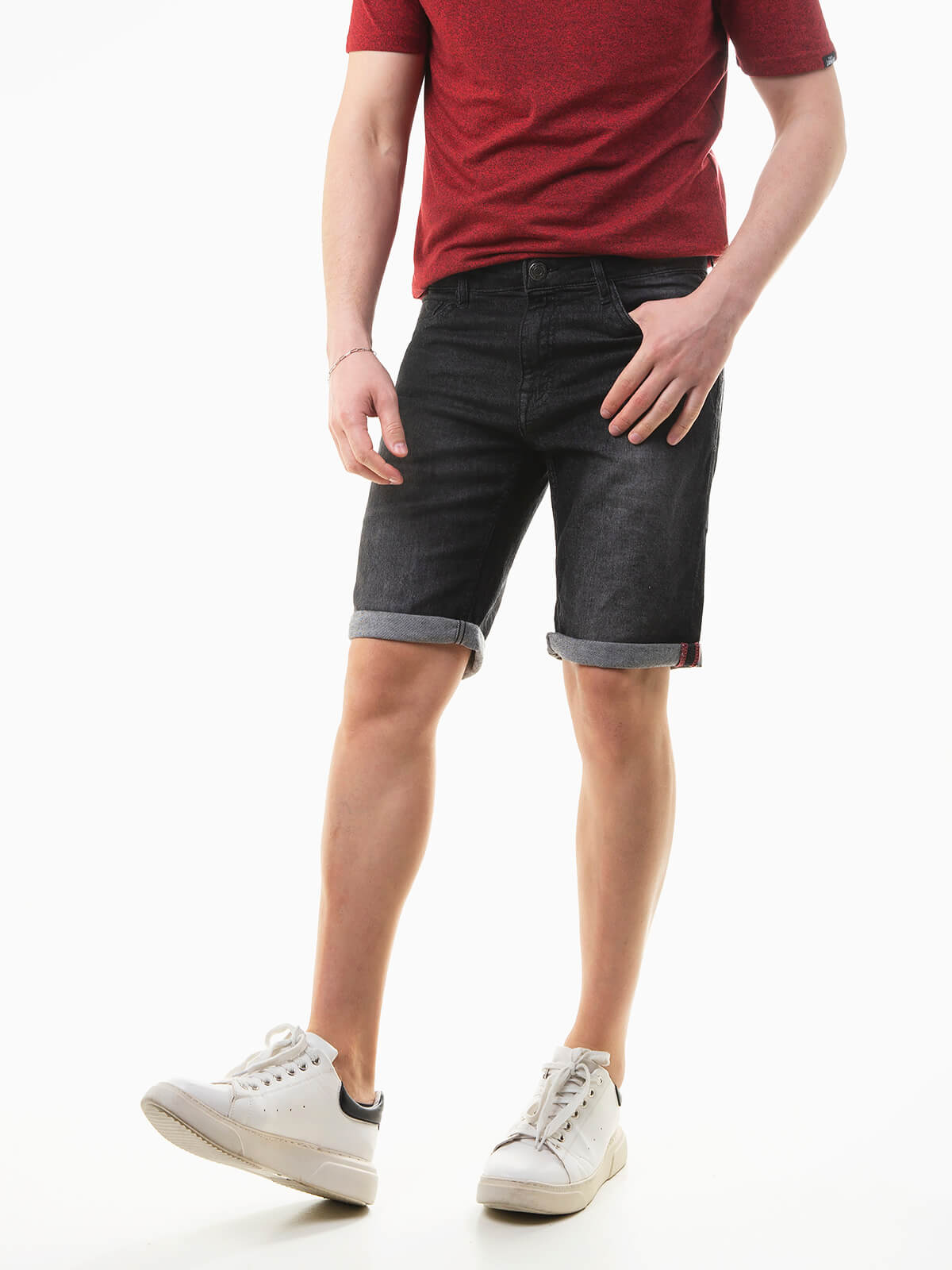 Calções de ganga pretos slim fit para homem. Calções elásticos com 5 bolsos e dobra na base. Aperto de fecho éclair e botão.