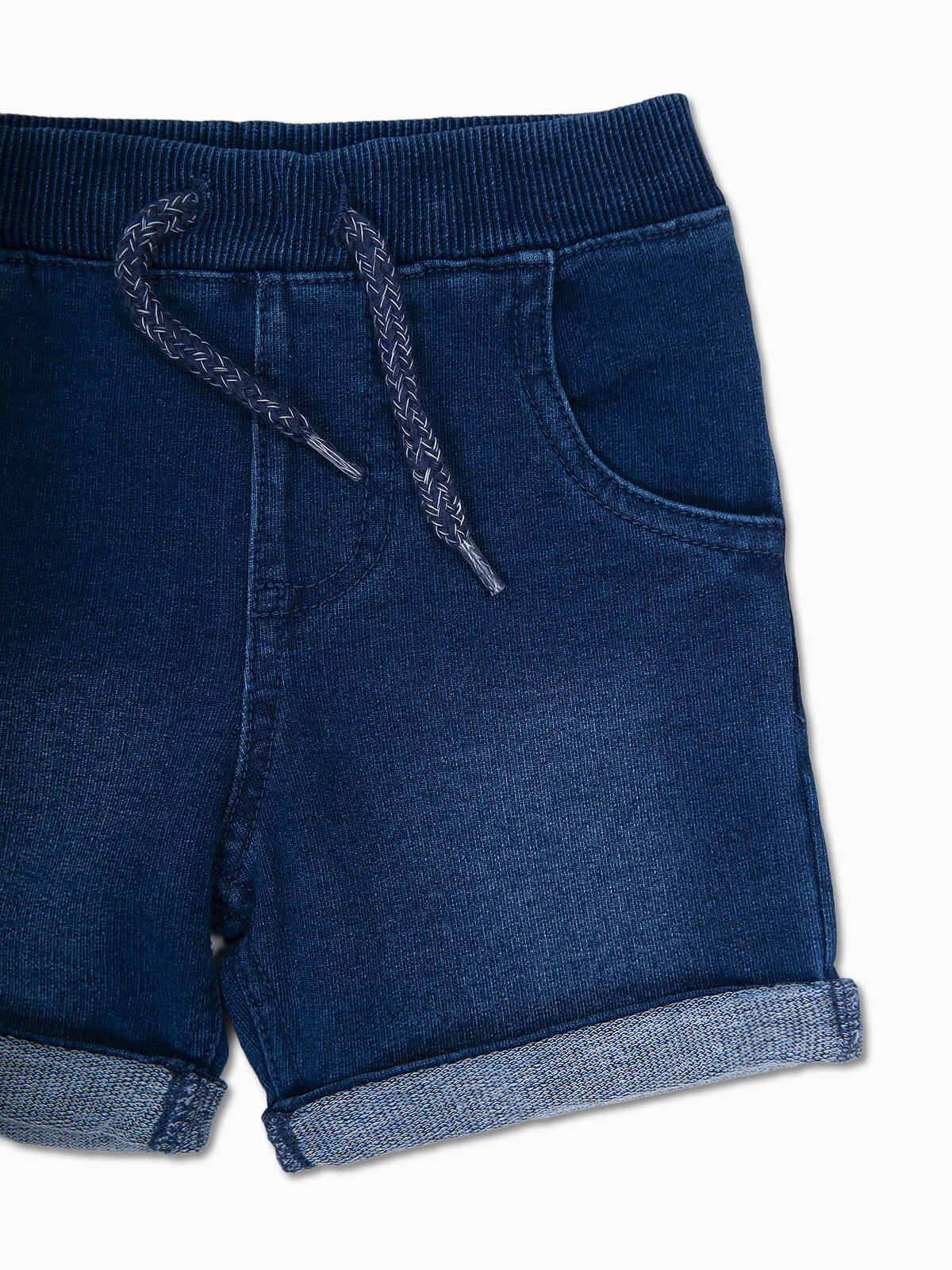 Calções jogger a imitar ganga para bebé menino. Calções de lavagem azul escuro com cintura elástica e cordão. Ajustador na cinta. 5 bolsos.