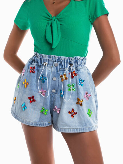 Calções largos de cintura alta para senhora. Calções estilo godê com acabamentos desfiados. 5 bolsos. Aperto fecho éclair e botão.