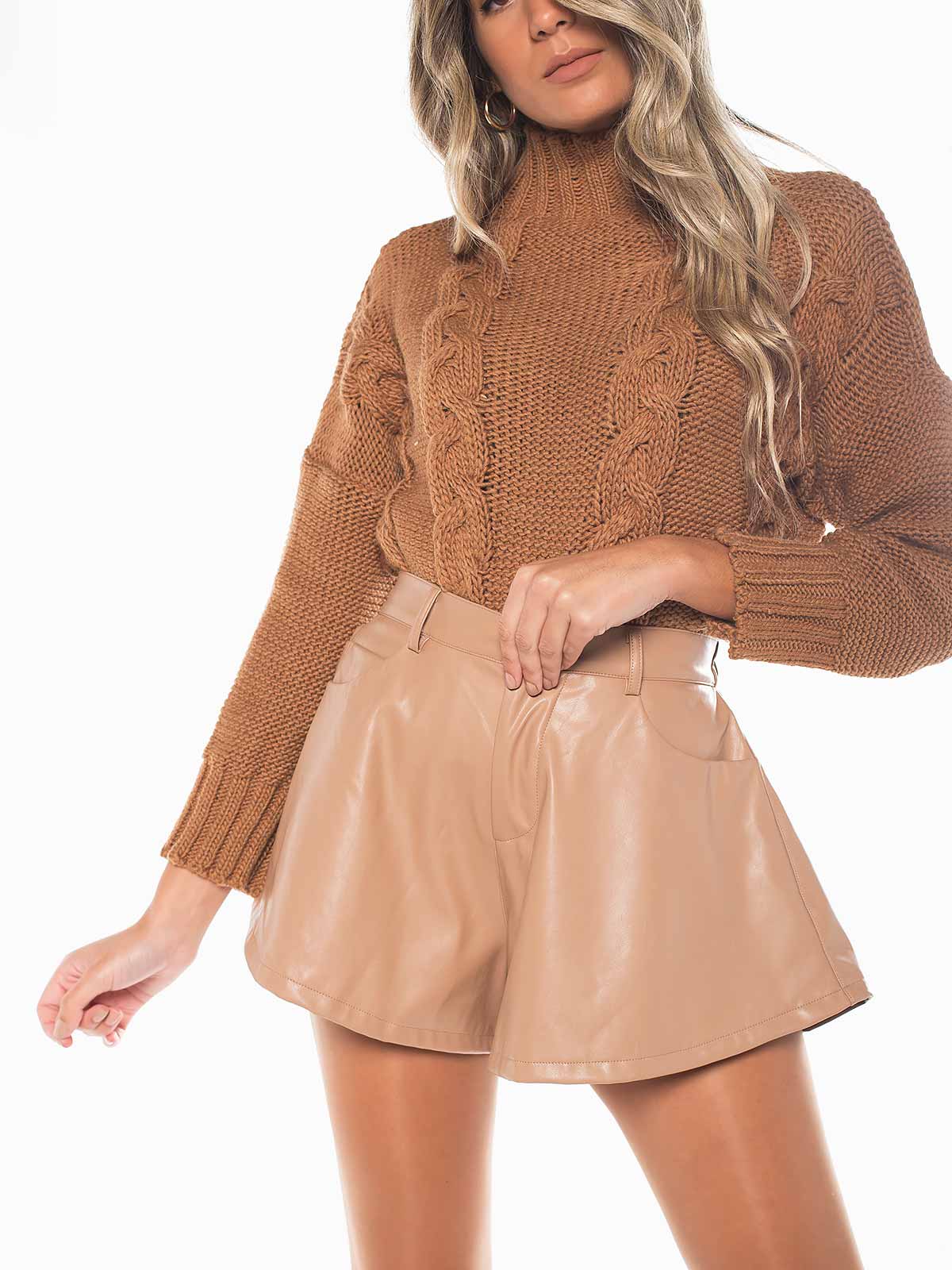Calções curtos largos em pele sintética. Calções cintura alta elástica com bolsos laterais e traseiros. Aperto de fecho éclair e botão.