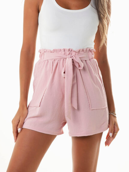 Calções pretos efeito pele com cintura alta paperbag para senhora. Calções curtos com botão aplicados e 2 bolsos.