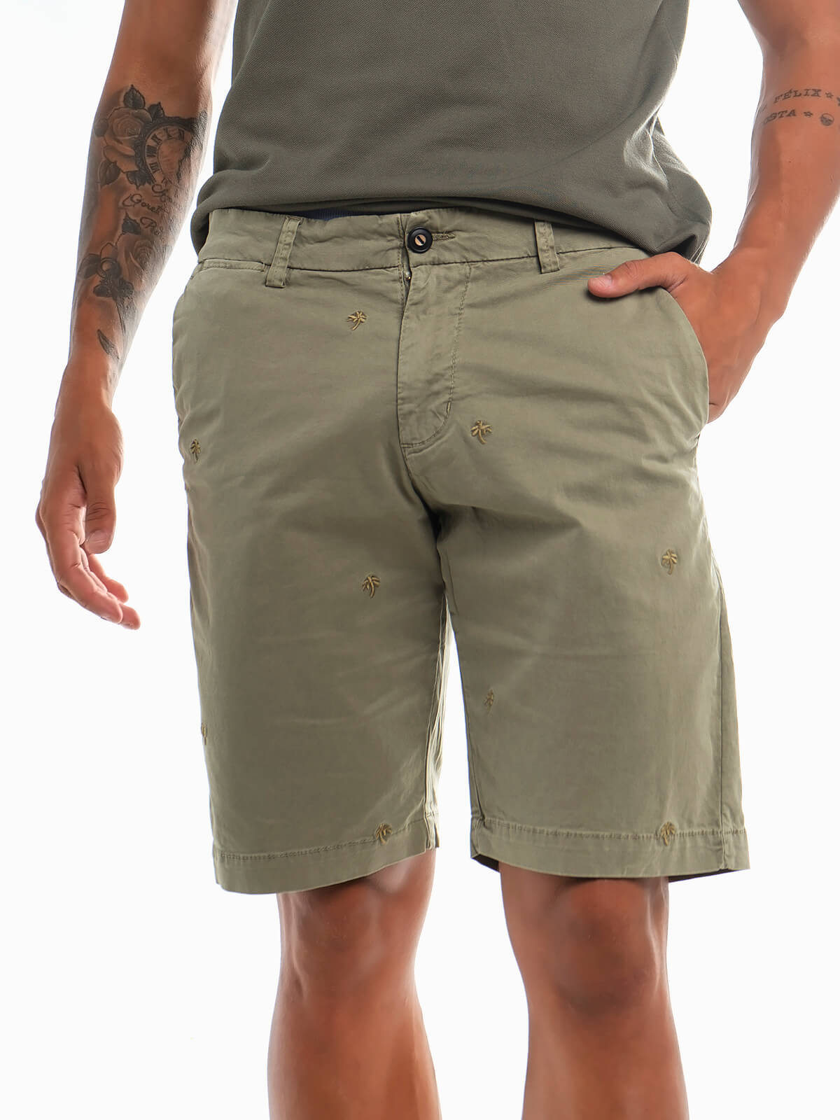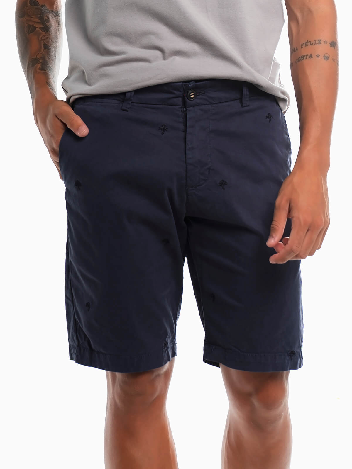 Calções sarja com bordado de palmeiras para homem. Calções chino com 4 bolsos. Aperto fecho éclair e botão.