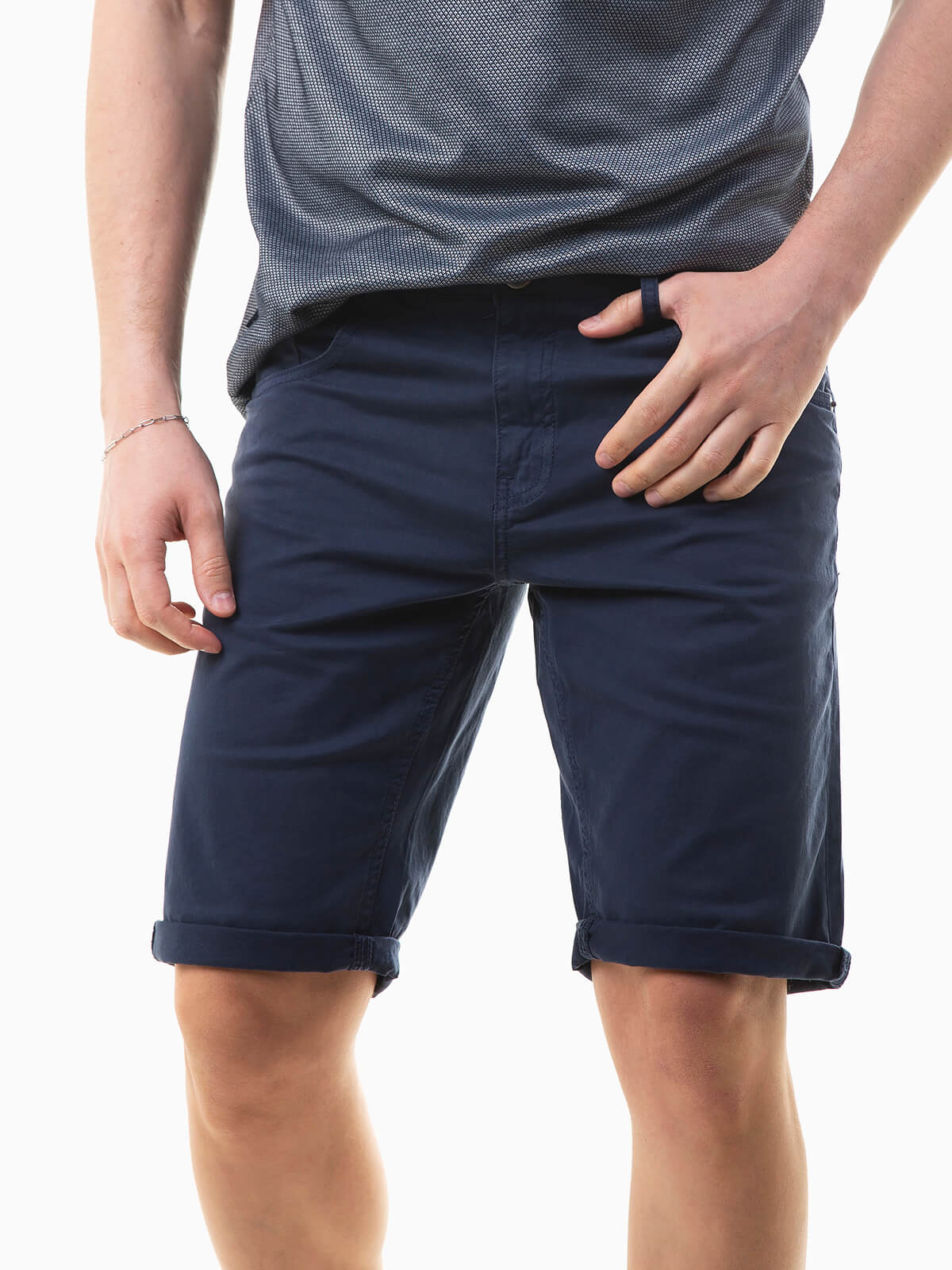 Calções elásticos em sarja de algodão para homem. Calções slim fit com dobra na base e 5 bolsos. Aperto de fecho éclair e botão.