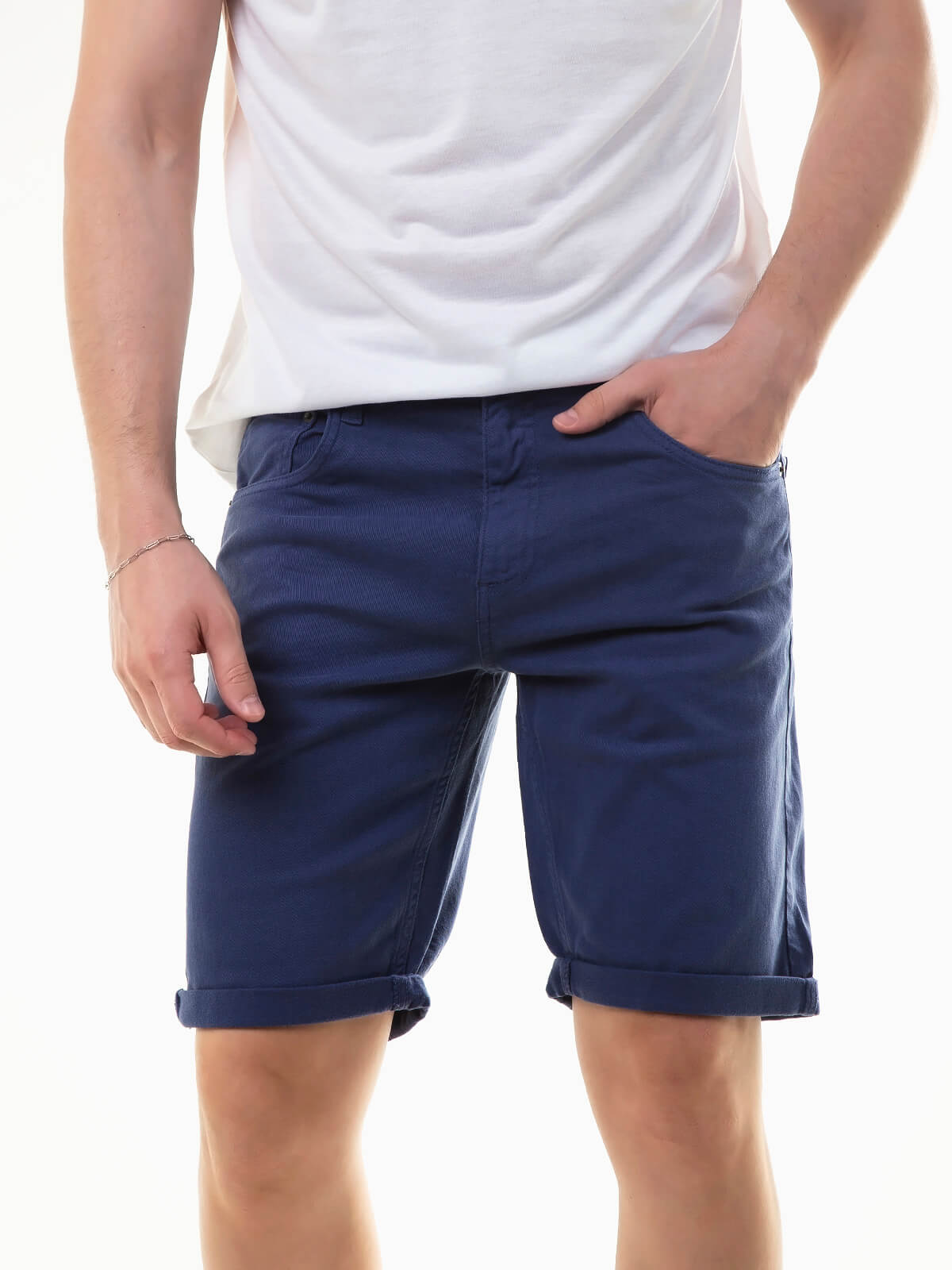 Calções sarja elásticos para homem. Calções slim fit com dobra na base e 5 bolsos. Aperto de fecho éclair e botão.