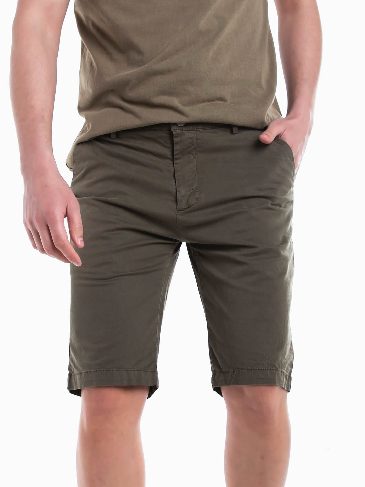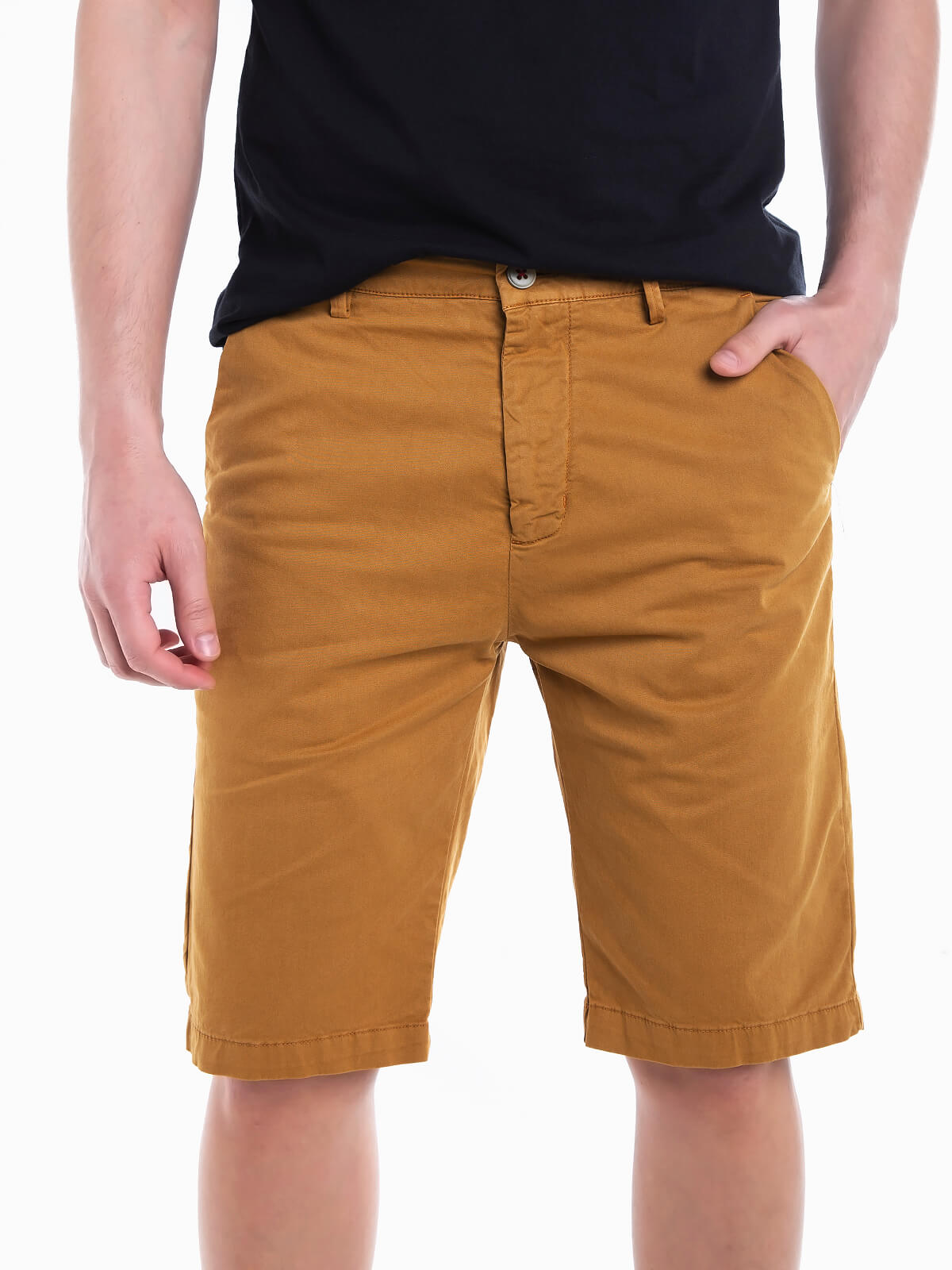 Calções de sarja slim fit para homem. Calções com dois bolsos laterais e dois na parte posterior com abertura debruada. Aperto fecho éclair e botão.