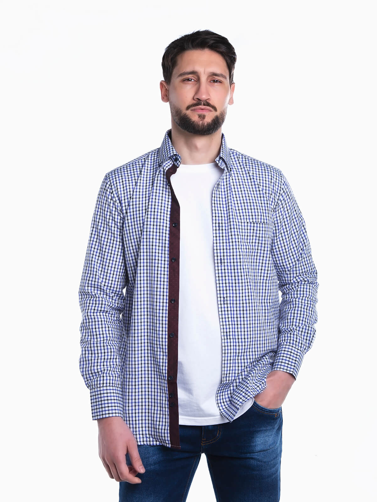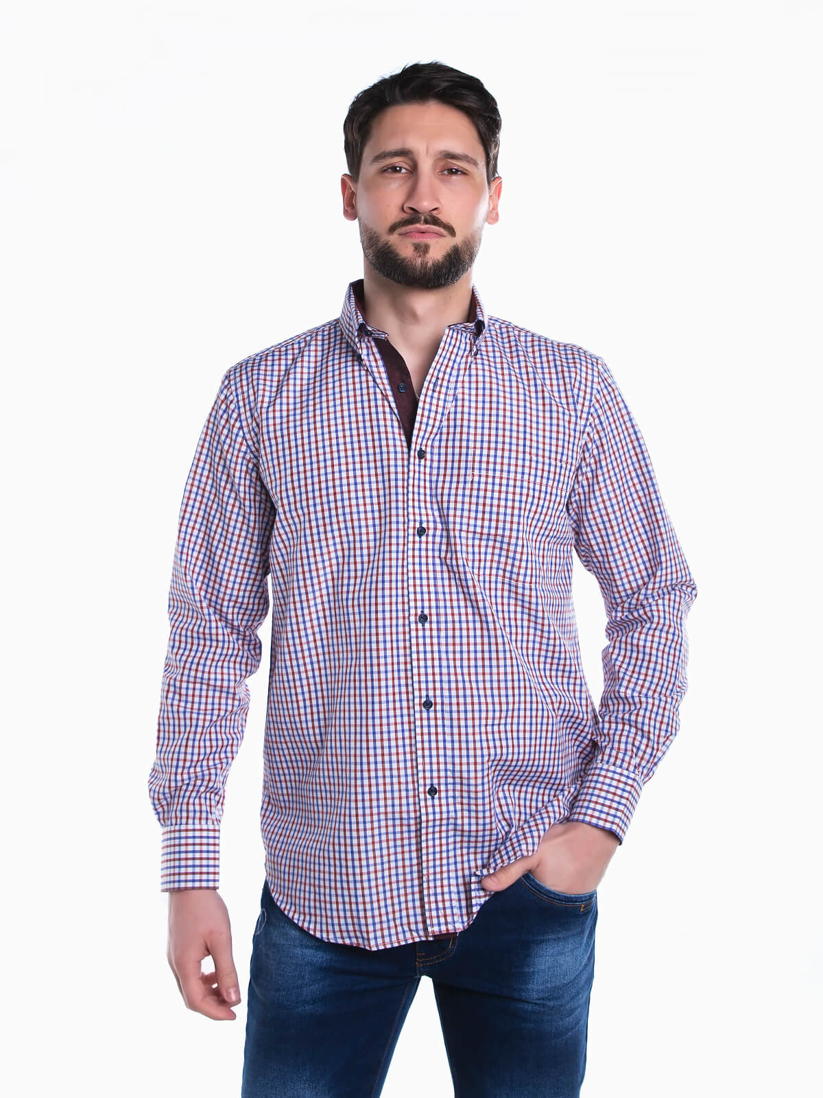Camisa homem regular fit xadrez 100% algodão. Manga comprida. Carcela e punhos de cor. 1 bolso no peito. Gola de abas. Aperto frontal de botões.