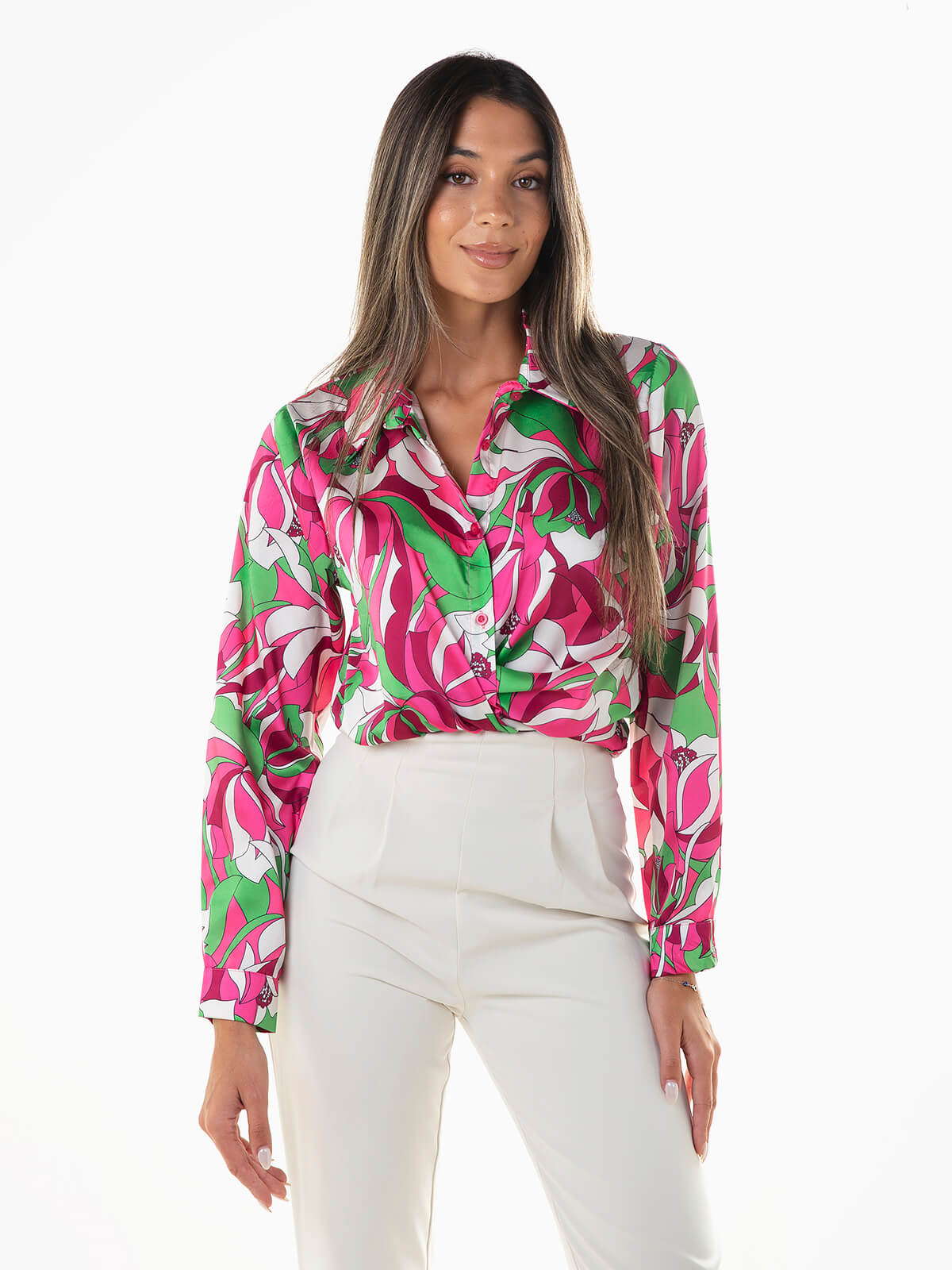 Camisa acetinada com flores coloridas. Camisa manga comprida com punhos abotoados e gola abas. Aperto de botões.