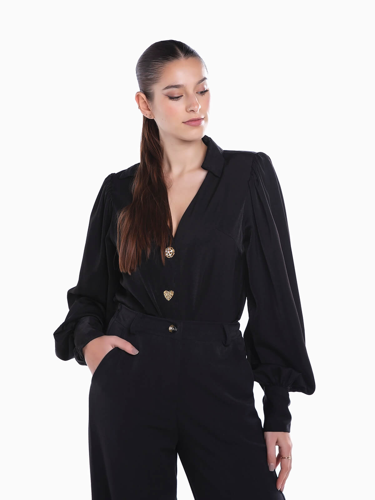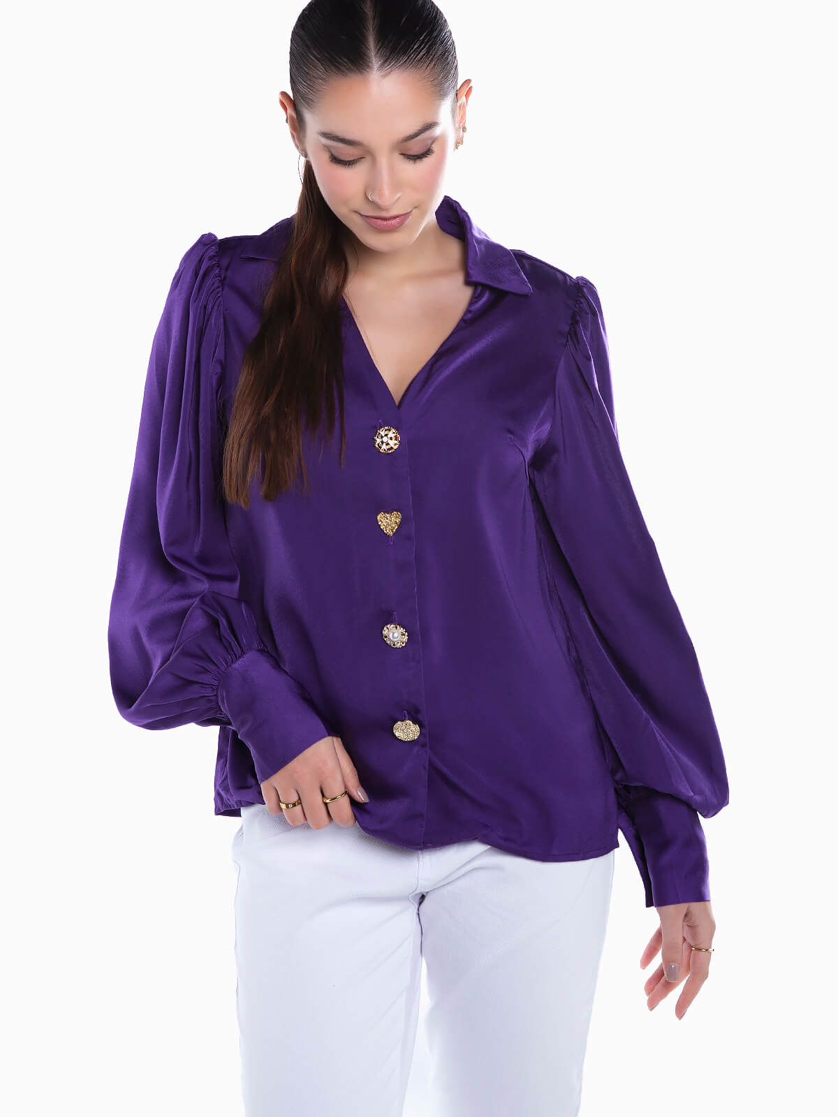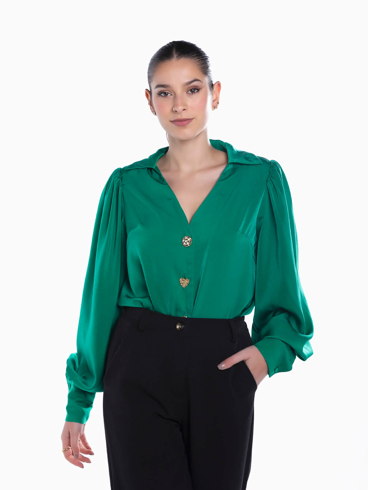 Camisa em tecido fluído acetinado com ombreiras aplicadas. Camisa com manga abalonada e punhos abotoados. Colarinho de aba e decote em bico. Aperto de botões diferenciados.