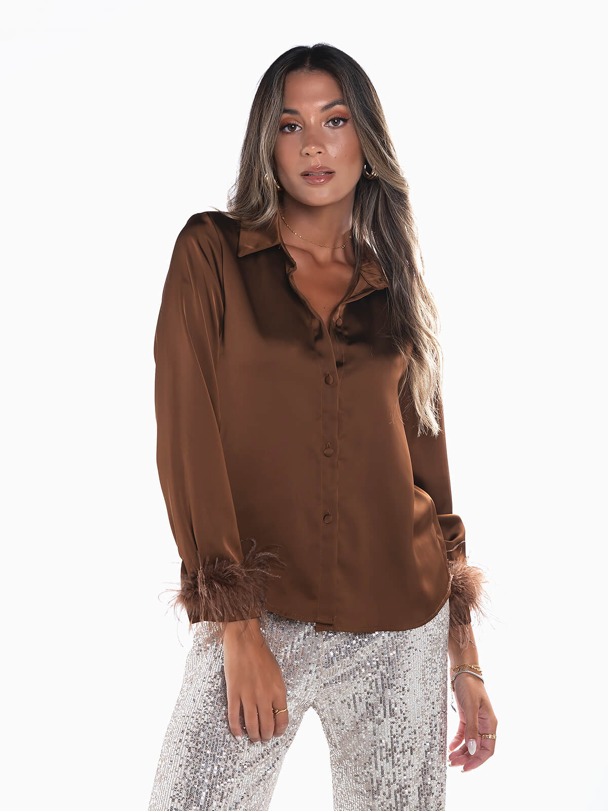 Camisa acetinada com plumas aplicadas nos punhos. Camisa fluída manga comprida com gola de abas. Aperto frontal de botões.