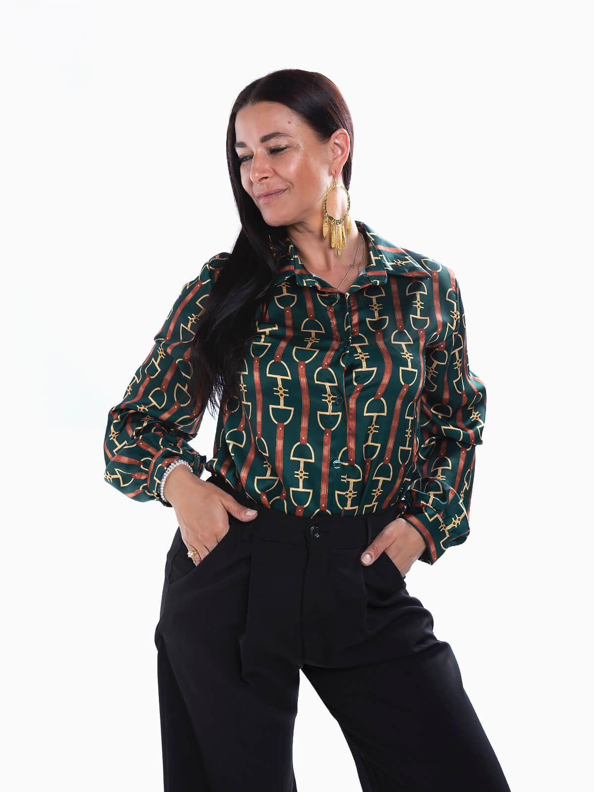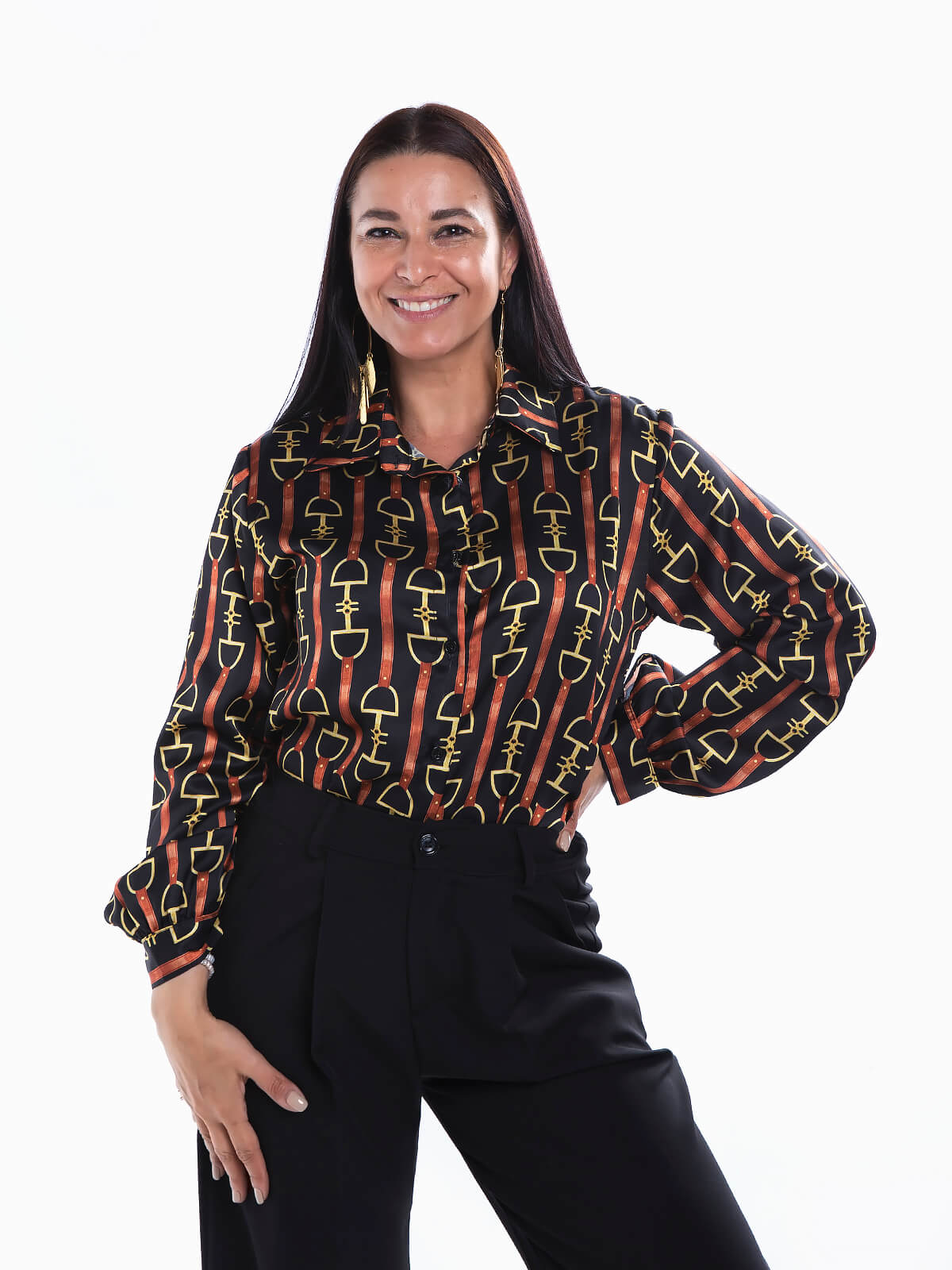 Camisa acetinada estampada com fivelas. Camisa fluida de manga comprida. Gola clássica. Aperto de botões na frente.