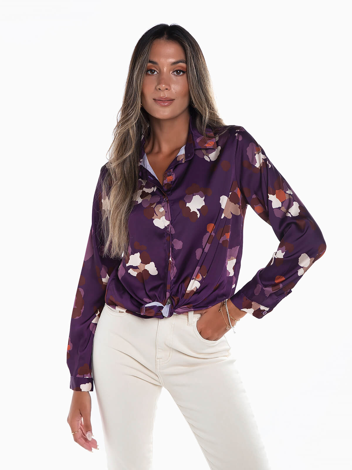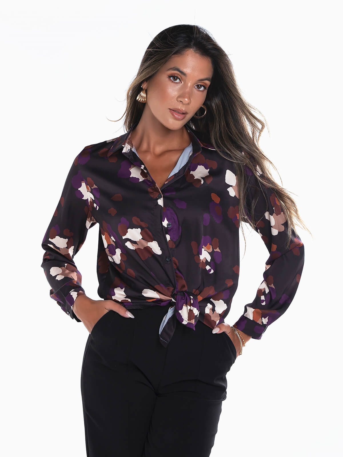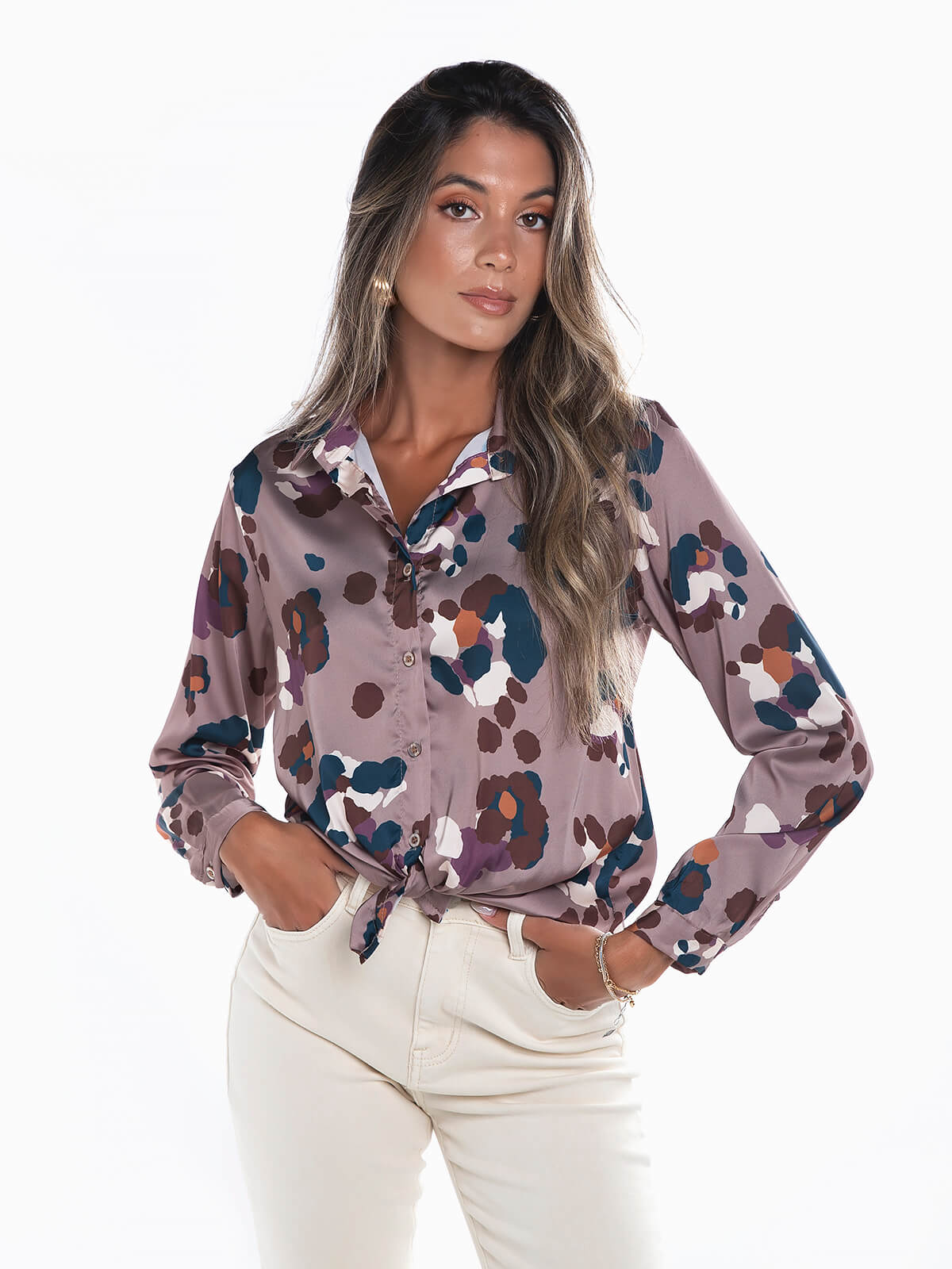 Camisa acetinada com estampado animal abstrato para senhora. Camisa manga comprida com punhos abotoados. Gola de abas. Aperto frontal de botões.