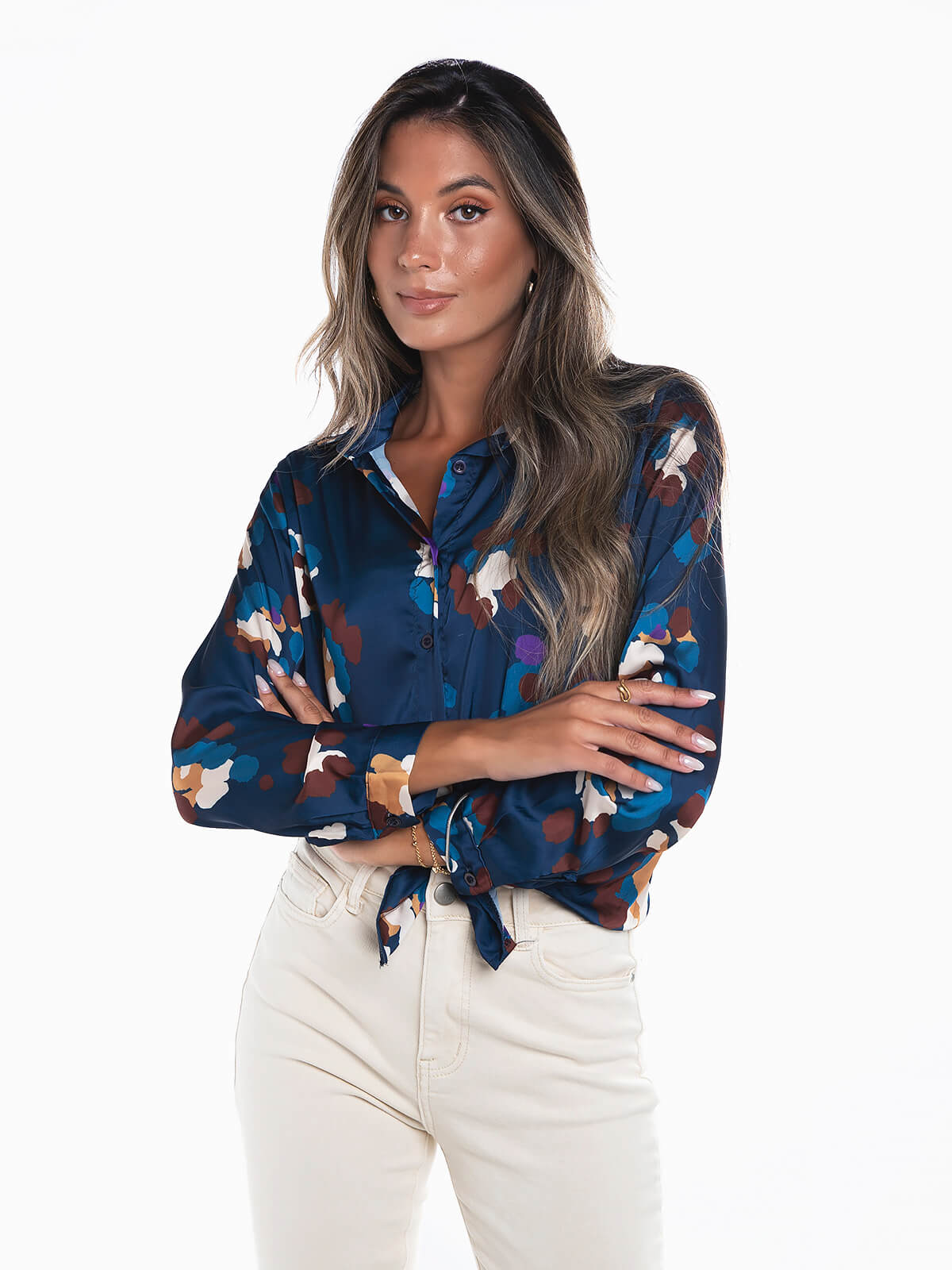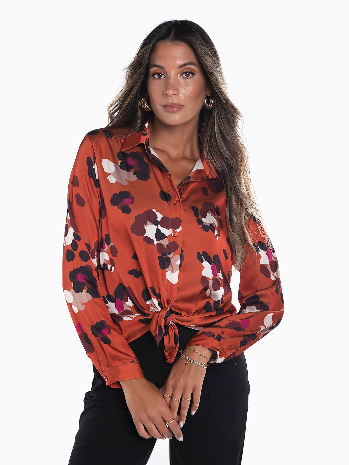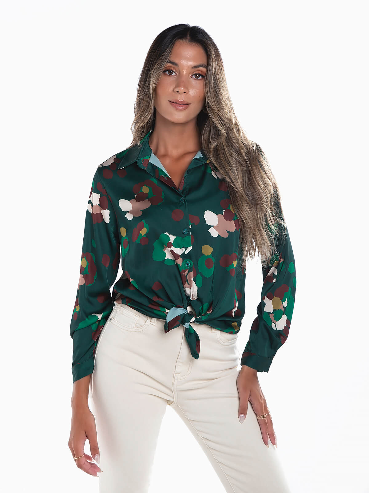 Camisa acetinada com estampado animal abstrato para senhora. Camisa manga comprida com punhos abotoados. Gola de abas. Aperto frontal de botões.