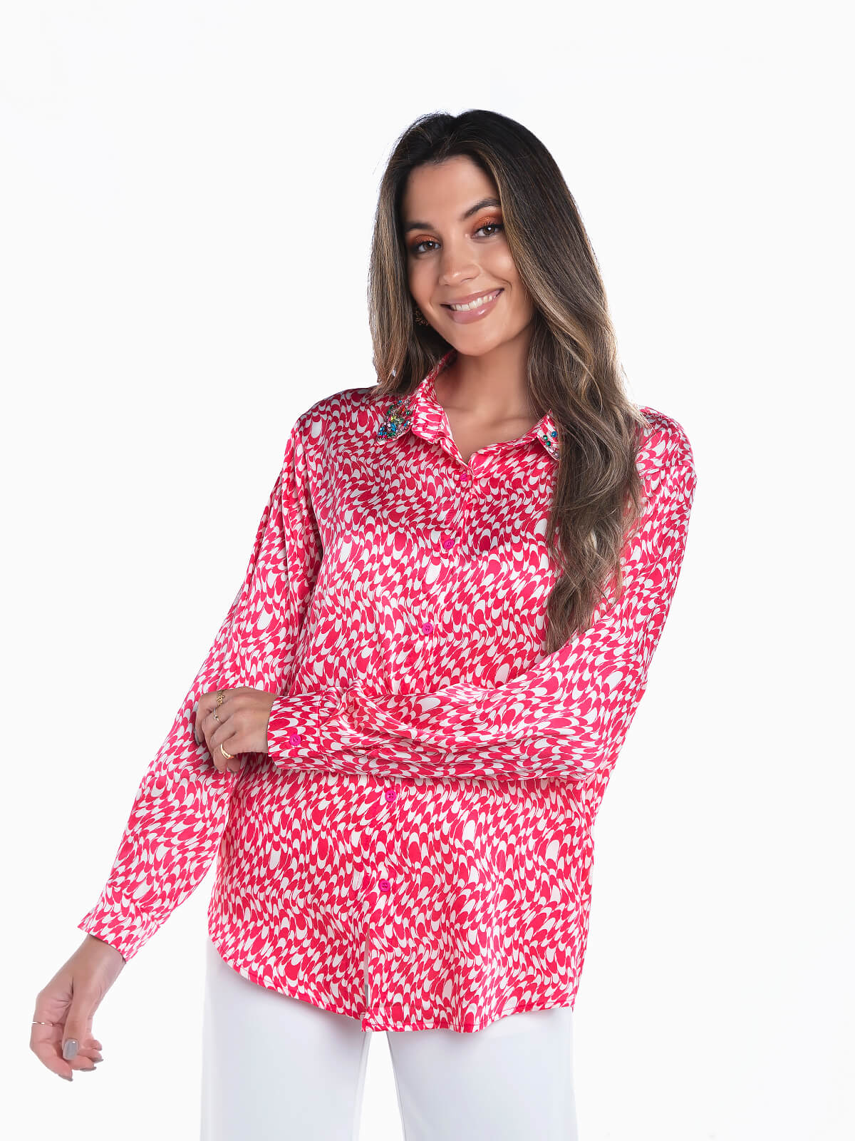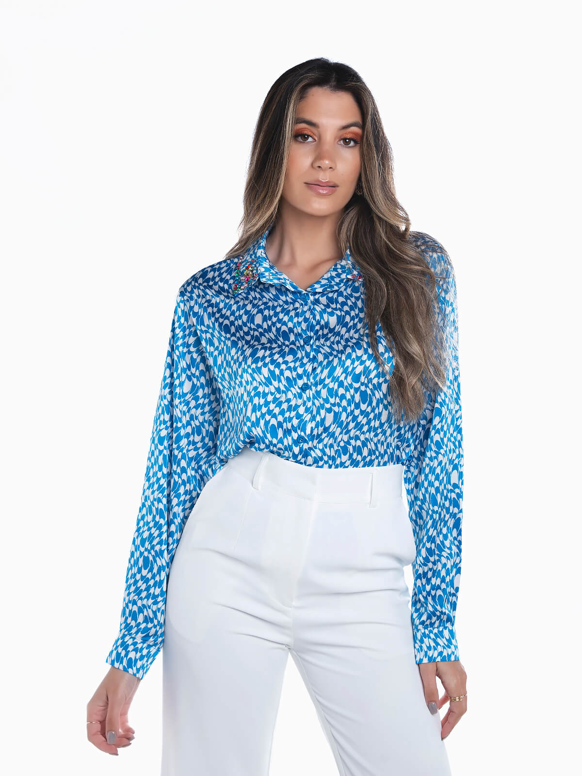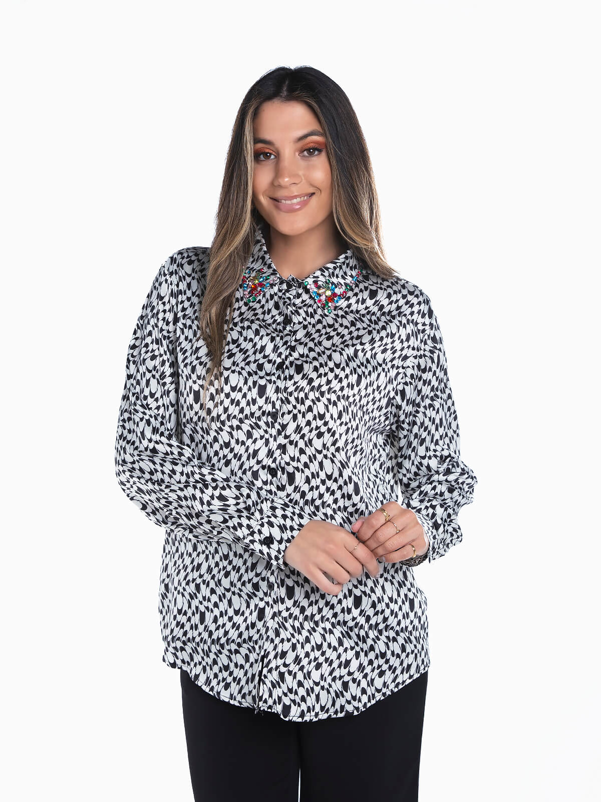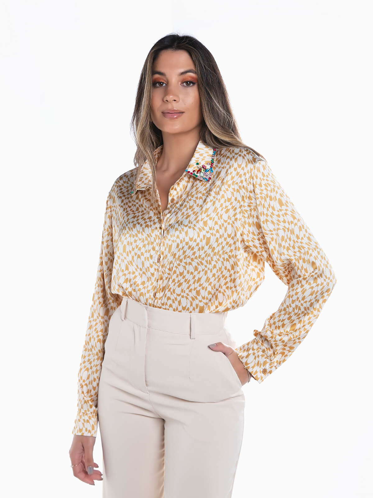 Camisa acetinada com estampado geométrico e pormenor de joias aplicadas no colarinho. Camisa de manga comprida com punhos abotoados. Gola de abas. Aperto frontal de botões.