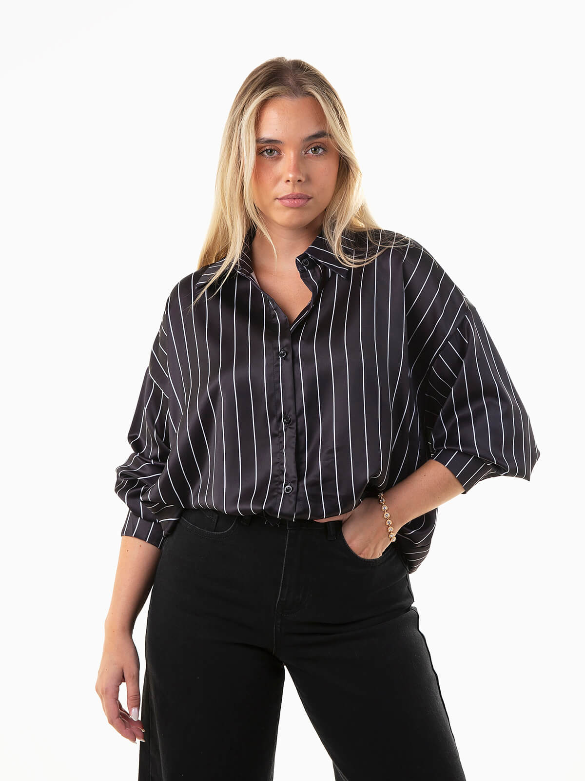 Camisa acetinada oversized às riscas, com gola de abas e punhos abotoados. Cós arredondado mais comprido atrás. Aperto de botões à frente, perfeita para looks modernos e descontraídos, fácil de combinar com calças ou saias.