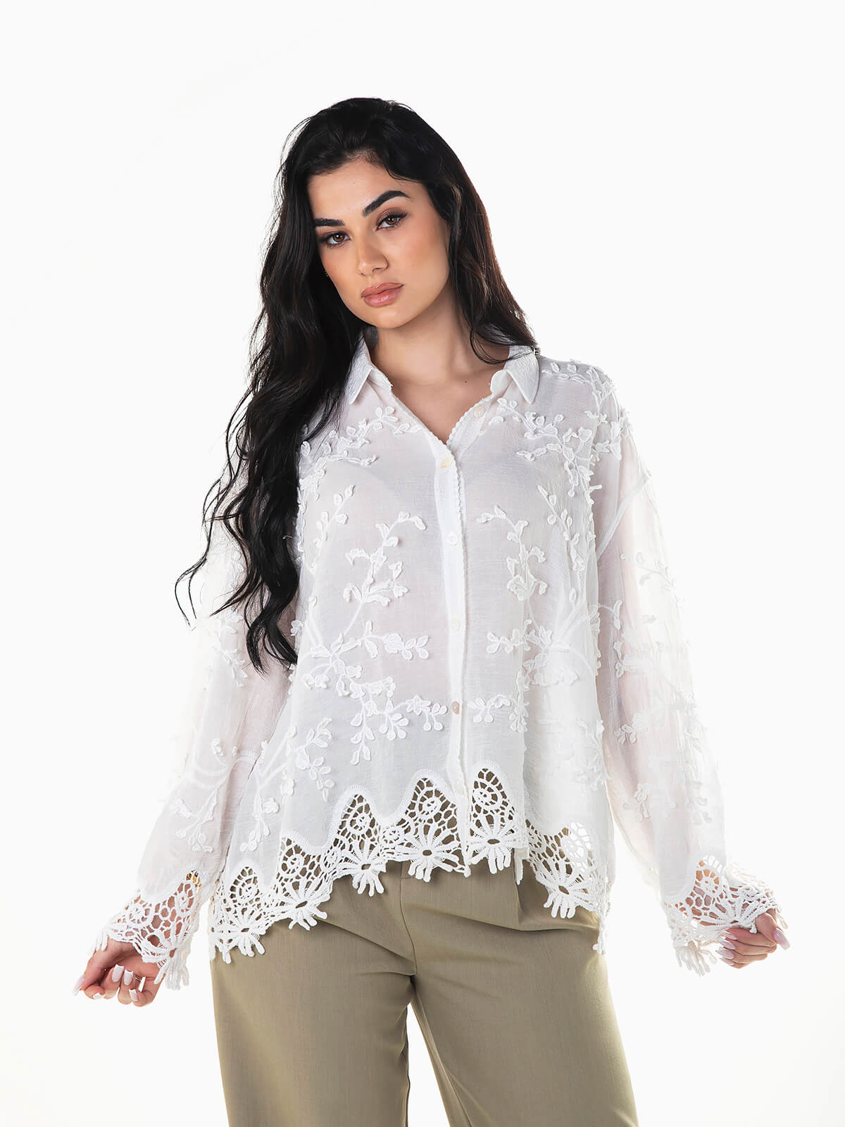 Camisa manga comprida com bordados e encaixe de crochet na base e mangas. Camisa em tecido 100% algodão para maior conforto e respirabilidade. Gola abas. Aperto de botões.
