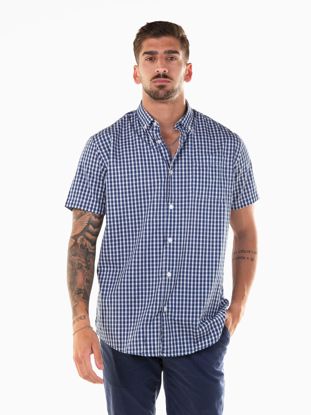 Camisa de manga curta aos quadrados azul marinho para homem. Camisa xadrez com bolso no peito e colarinho americano. Aperto frontal de botões.