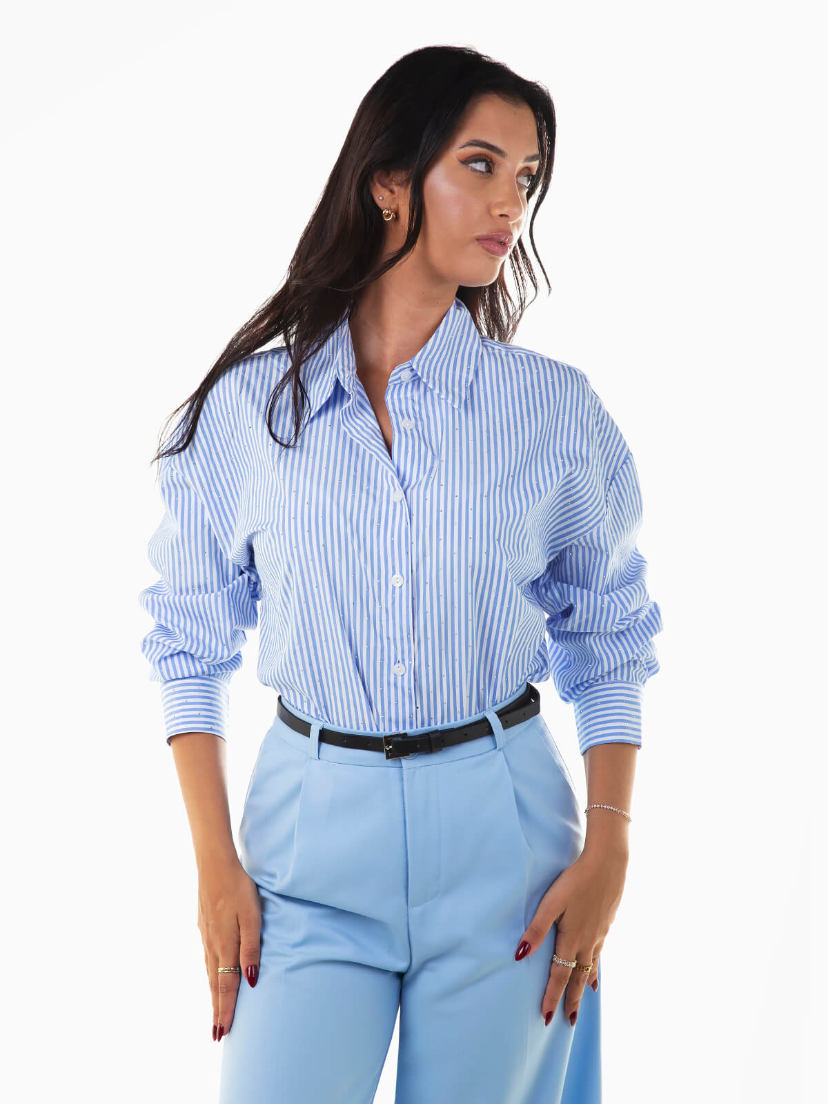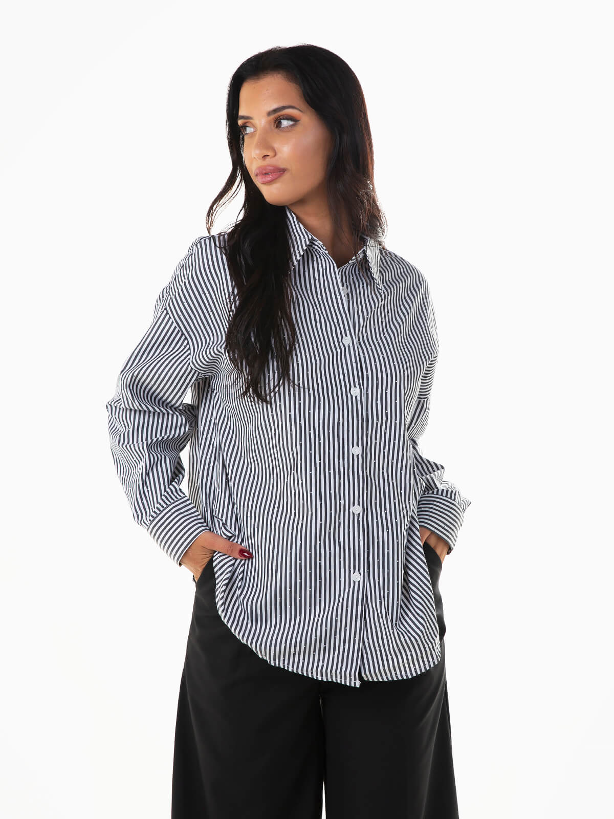 Camisa às riscas com strass aplicado para efetio brilhante. Camisa oversize manga comprida com punhos abotoados e gola abas. Aperto frontal de botões.
