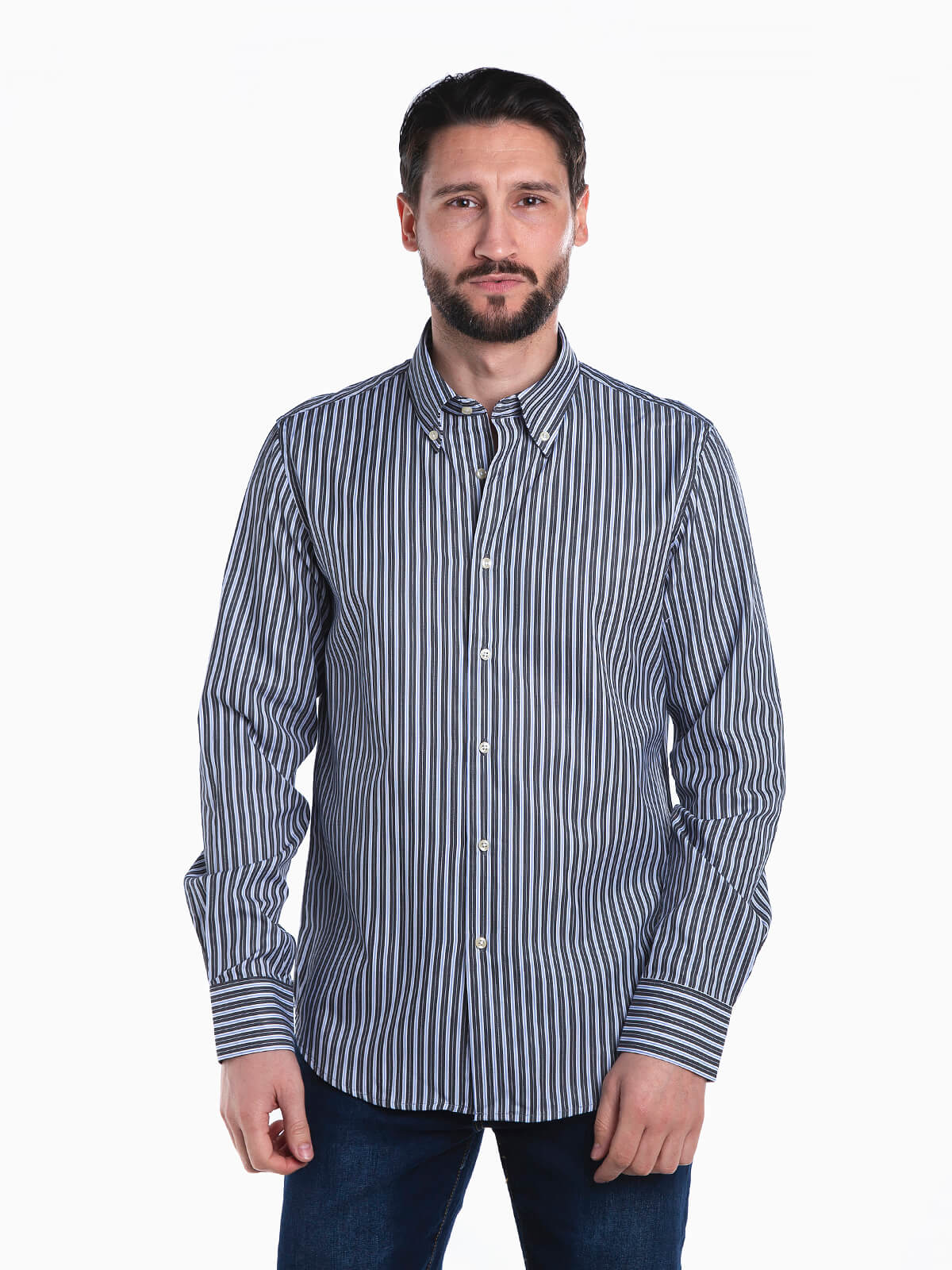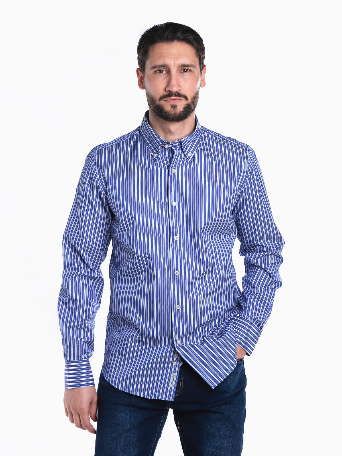 Camisa às riscas slim fit de manga comprida com punhos abotoados. Camisa com gola de abas e aperto de botões.