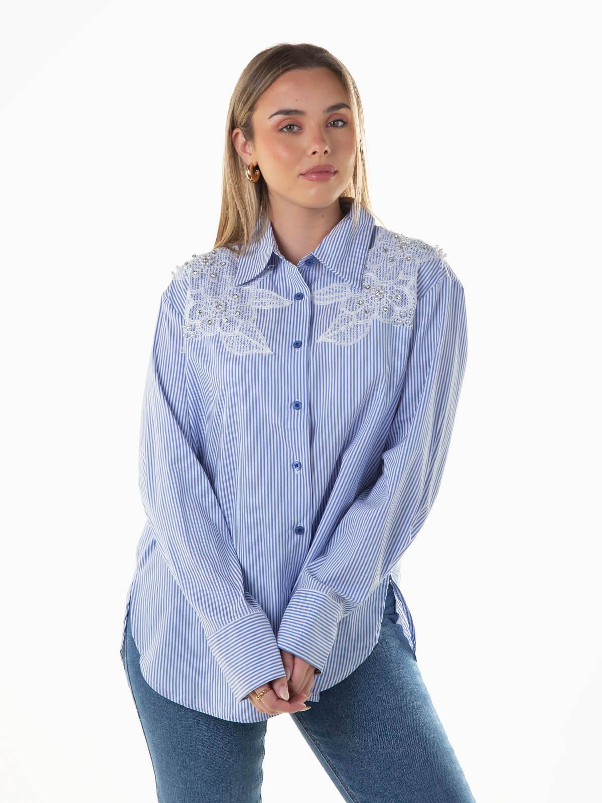 Camisa azul às riscas com renda, pérolas e brilhantes aplicados. Camisa oversize de manga comprida com cós arredondado mais comprido atrás. Punhos abotoados. Gola abas. Aperto frontal de botões.