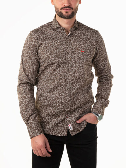 Camisa azul slim fit com padrão geométrico, punhos abotoados e gola de abas. Confortável e elegante, é ideal para looks com personalidade. Combina com calças chino ou jeans escuros para um visual casual sofisticado.