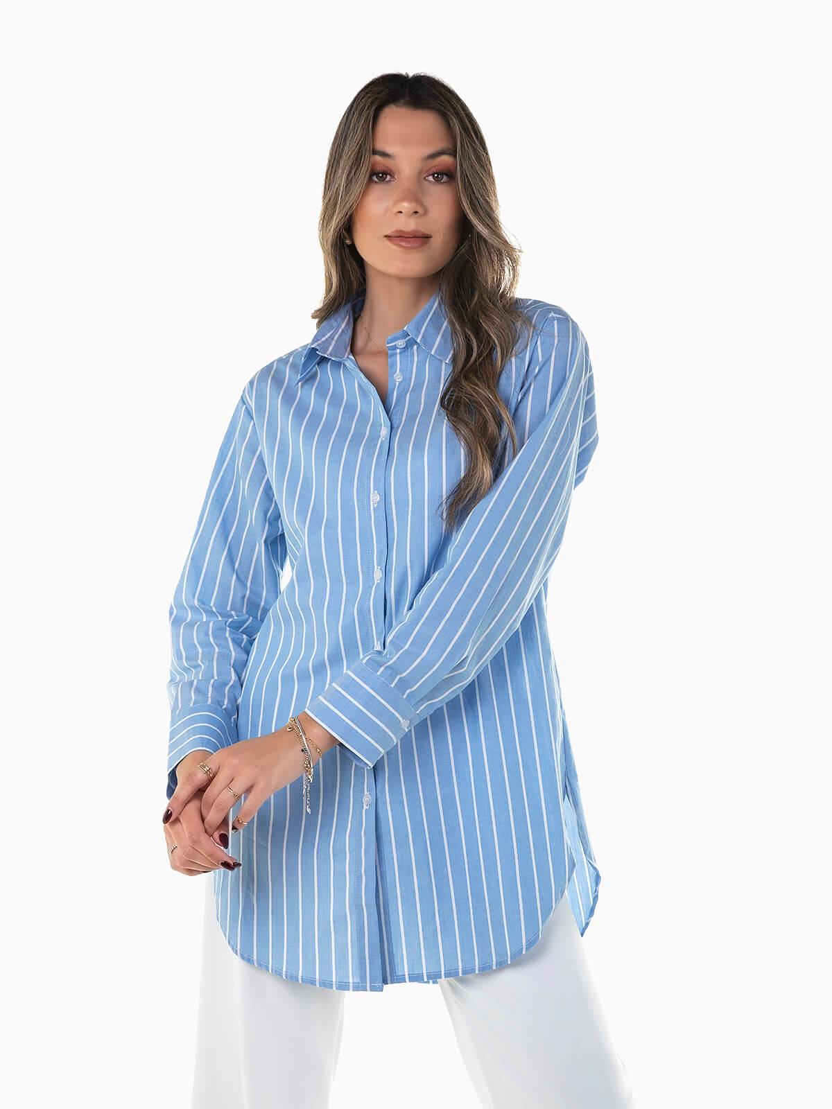 Camisa azul comprida às riscas brancas. Camisa popelina de manga comprida com punhos abotoados. Gola abas. Aperto de botões.