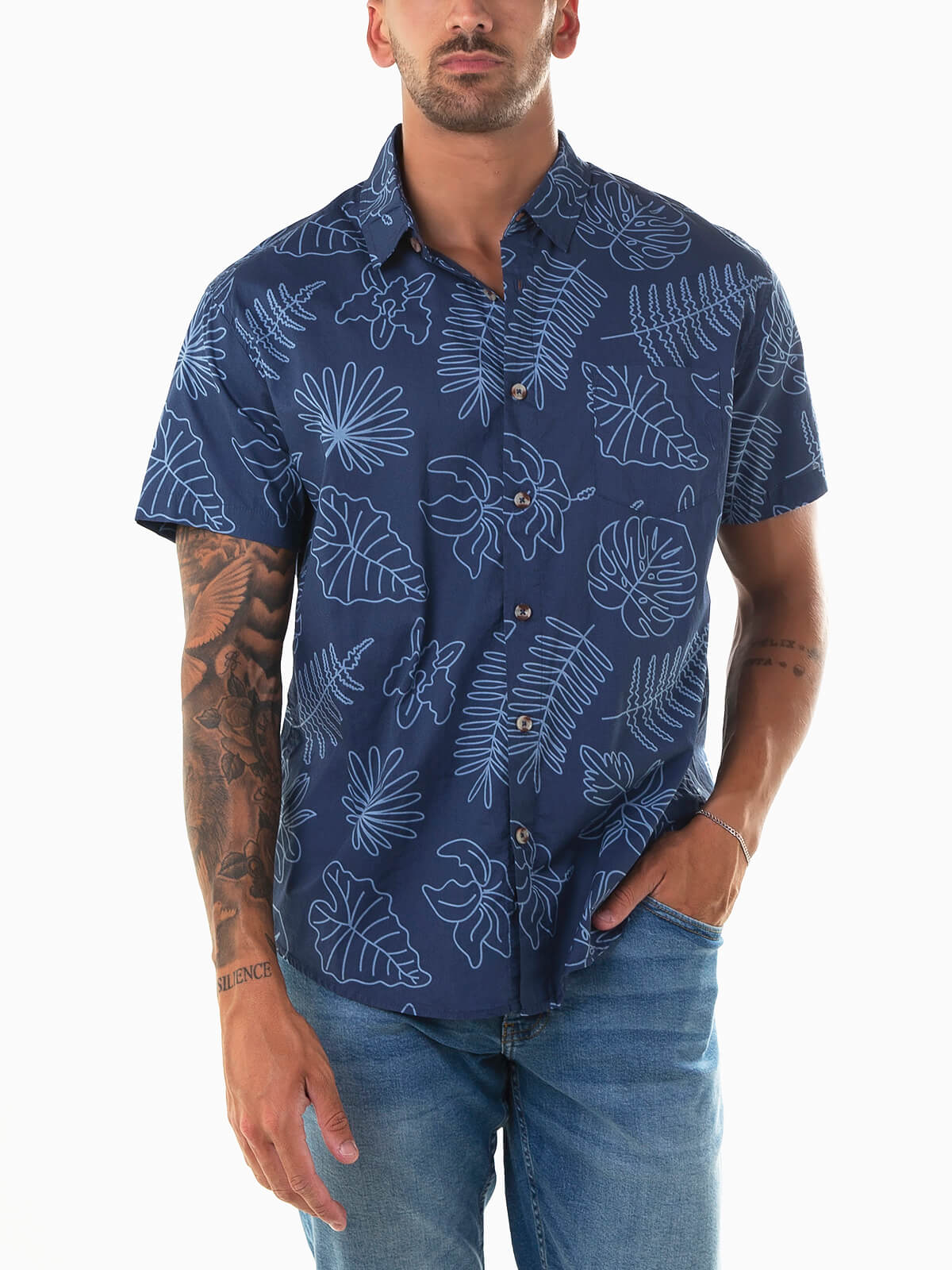 Camisa azul marinho com estampado de folhas em contraste. Camisa de manga curta para homem com bolso no peito. Gola abas. Aperto de botões.