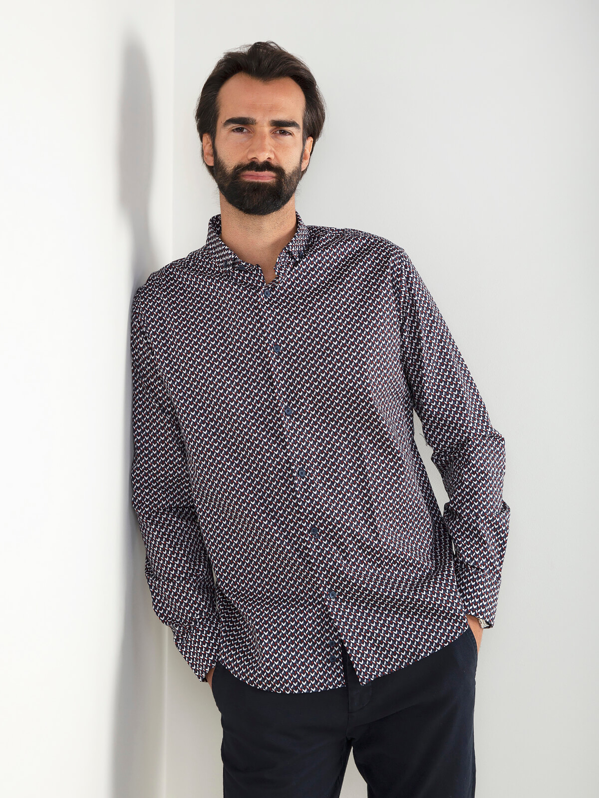 Camisa azul marinho de manga comprida com padrão geométrico. Colarinho americano, punhos abotoados e aperto frontal de botões. Ideal para combinar com calças chino para um look clássico.