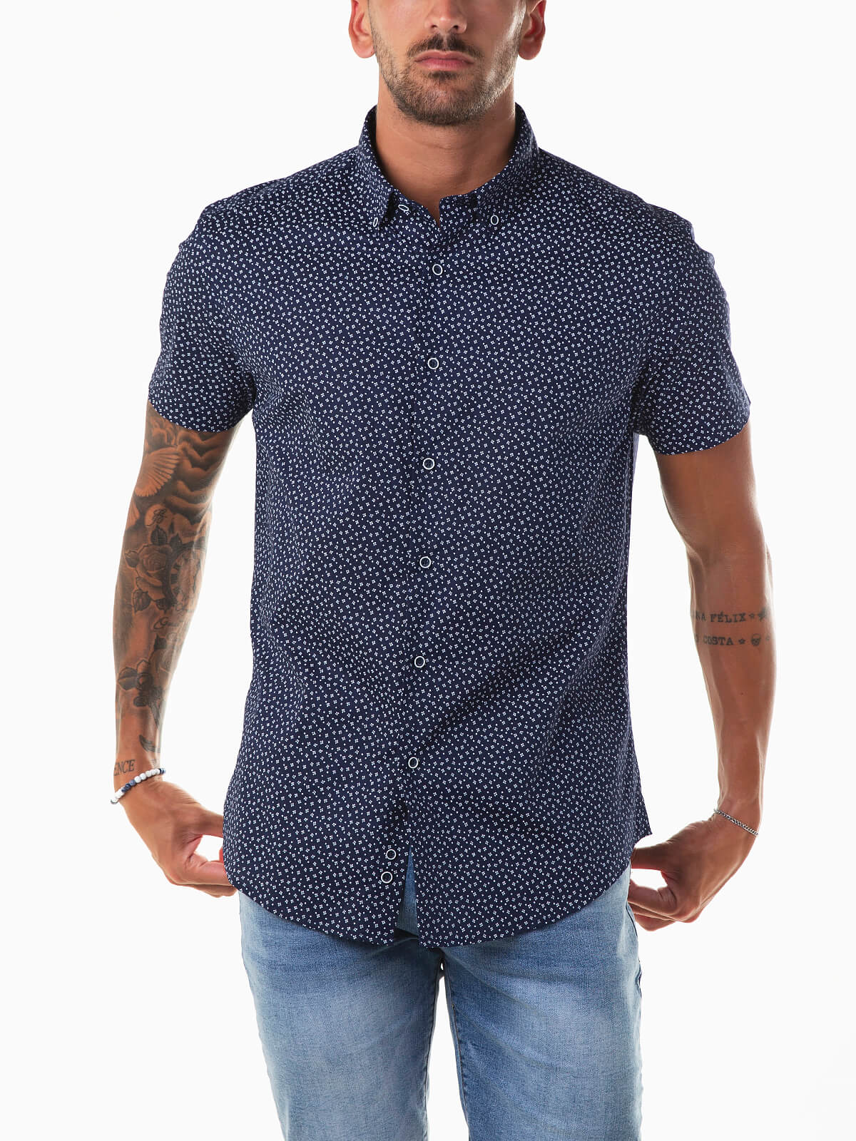 Camisa azul marinho com estampado em contraste. Camisa manga curta para homem em tecido 100% algodão para maior conforto. Colarinho americano. Aperto frontal de botões.