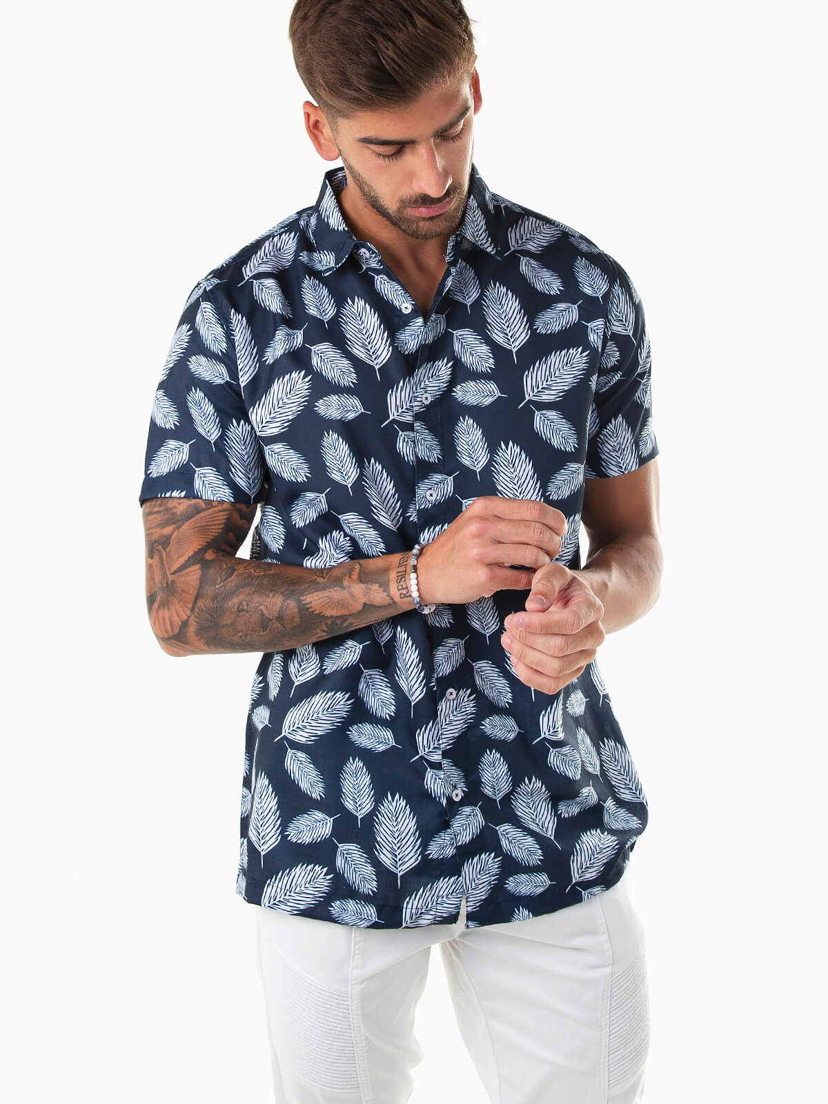 Camisa de manga curta azul marinho com estampado de folhas brancas em contraste. Camisa para homem com colarinho aba e aperto frontal de botões.