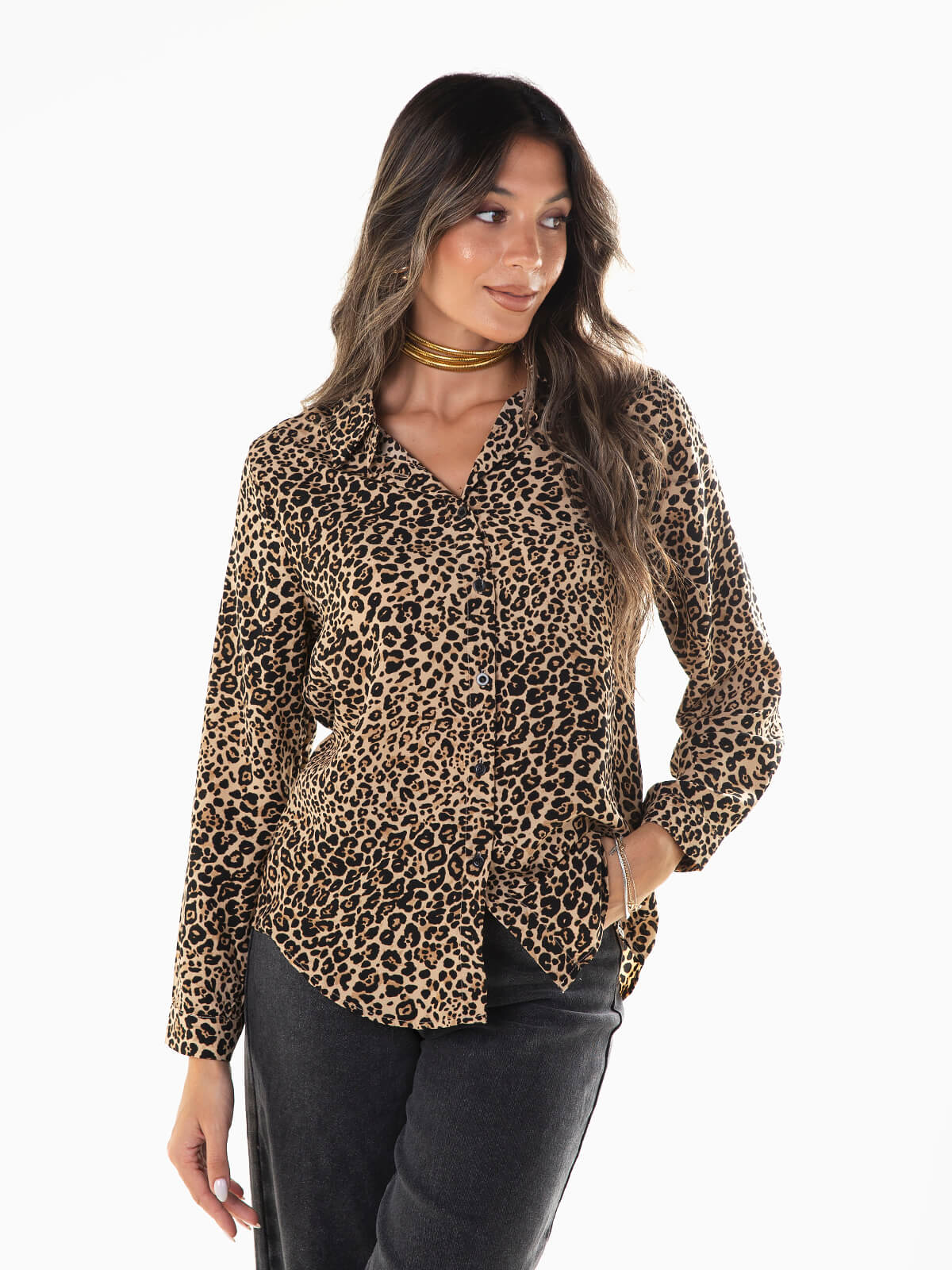 Camisa bege animal print para senhora. Camisa de manga comprida com punhos abotoados e gola abas. Cós arredondado. Aperto de botões.
