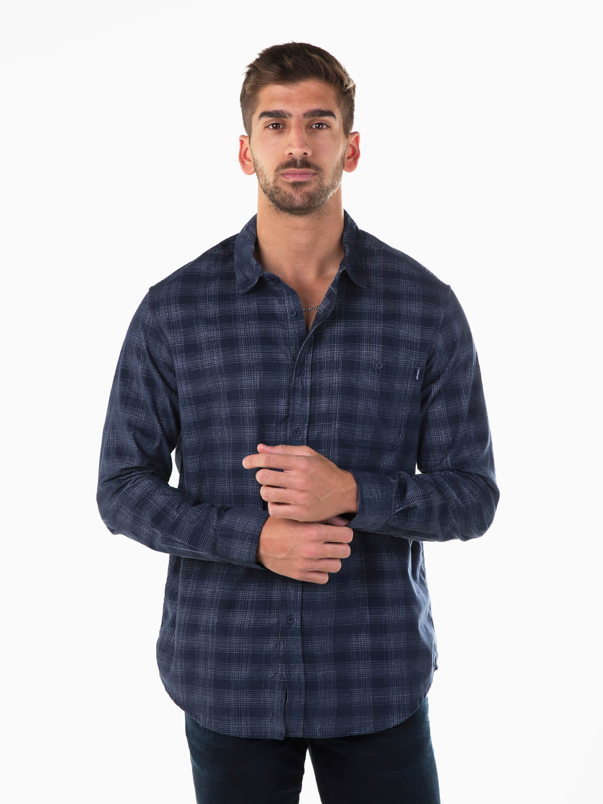 Camisa de bombazina em xadrez azul marinho para homem. Camisola de manga comprida com punhos abotoados e bolso no peito. Gola abas. Aperto frontal de botões.