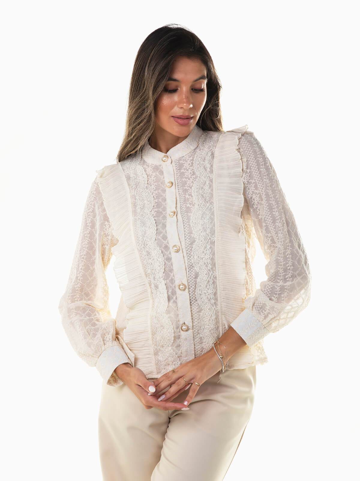 Camisa bordada com folhos plissados aplicados à frente. Camisa romântica com gola mao e punhos abotoados. Aperto de botões com pérolas.