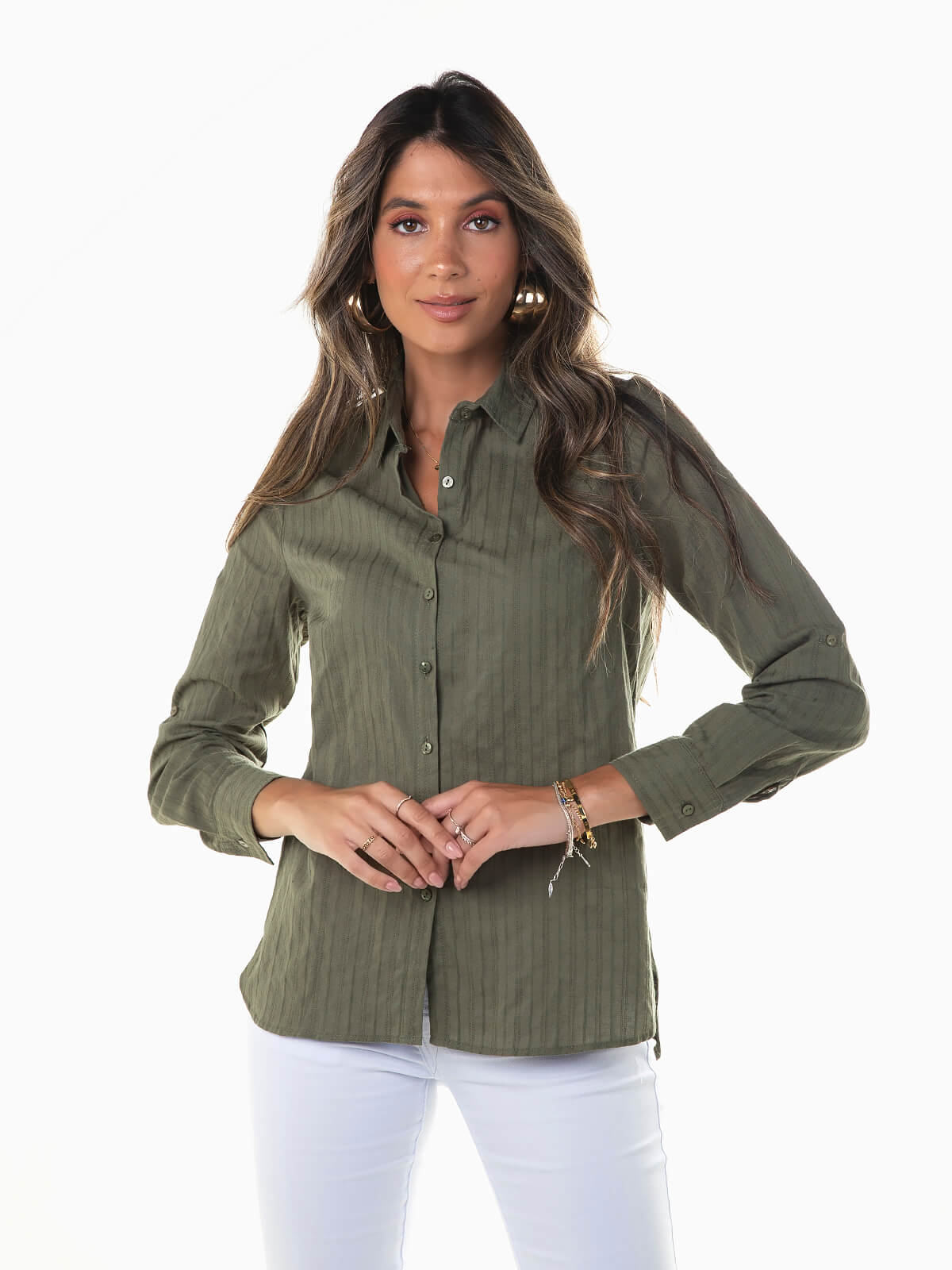 Camisa de manga comprida com bordados à cor. Camisa para senhora com punhos abotoados e presilha para ajustar. Gola abas. Aperto frontal de botões.