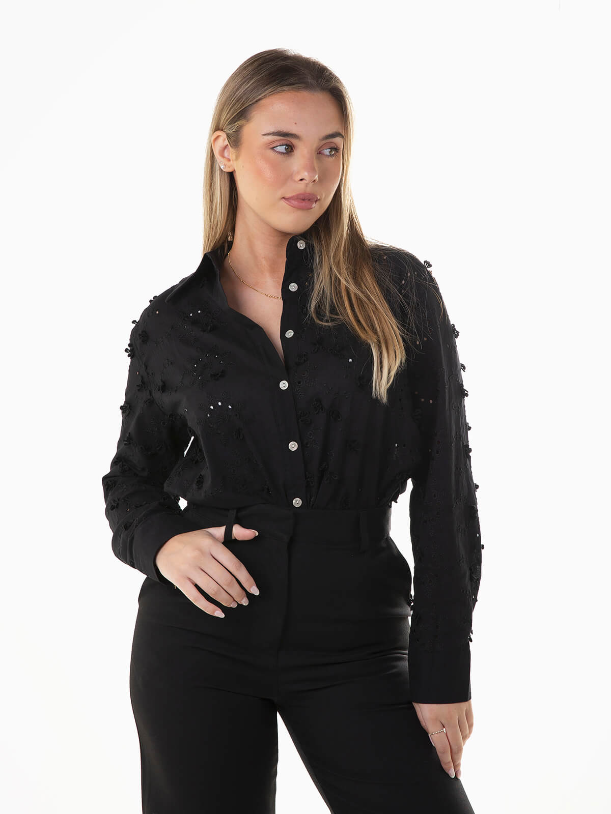 Camisa em bordado inglês com flores e gola de abas. Camisa romântica de manga comprida com punhos abotoados. Aperto frontal de botões.