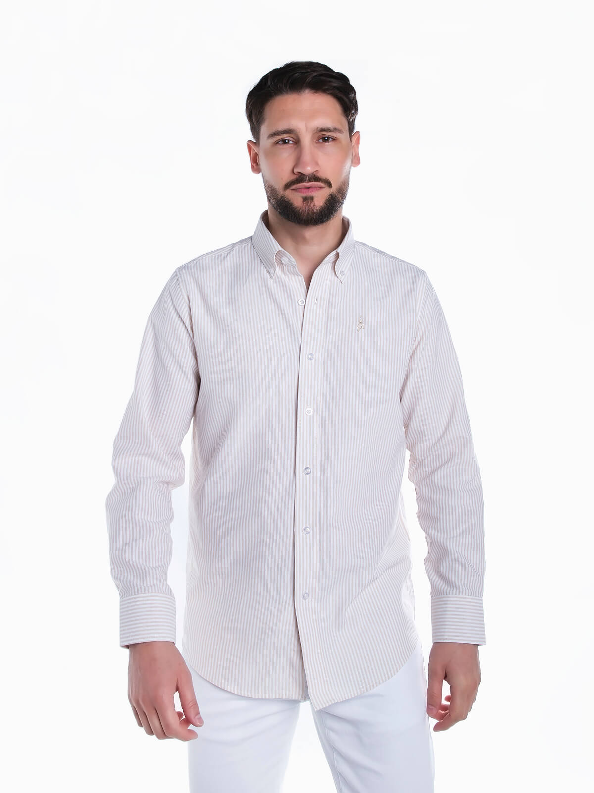 Camisa branca às riscas bege para homem. Camisa de manga comprida com punhos abotoados. Colarinho com botões e símbolo bordado no peito. Aperto frontal de botões.