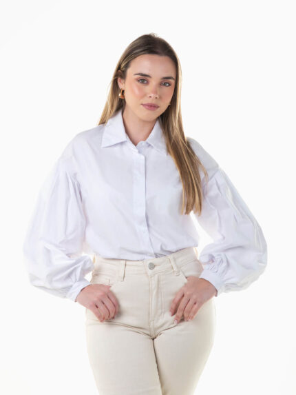 Camisa branca cintada com folhos aplicados. Camisa manga comprida com punhos abotoados e aperto de botões. Gola subida com abertura.